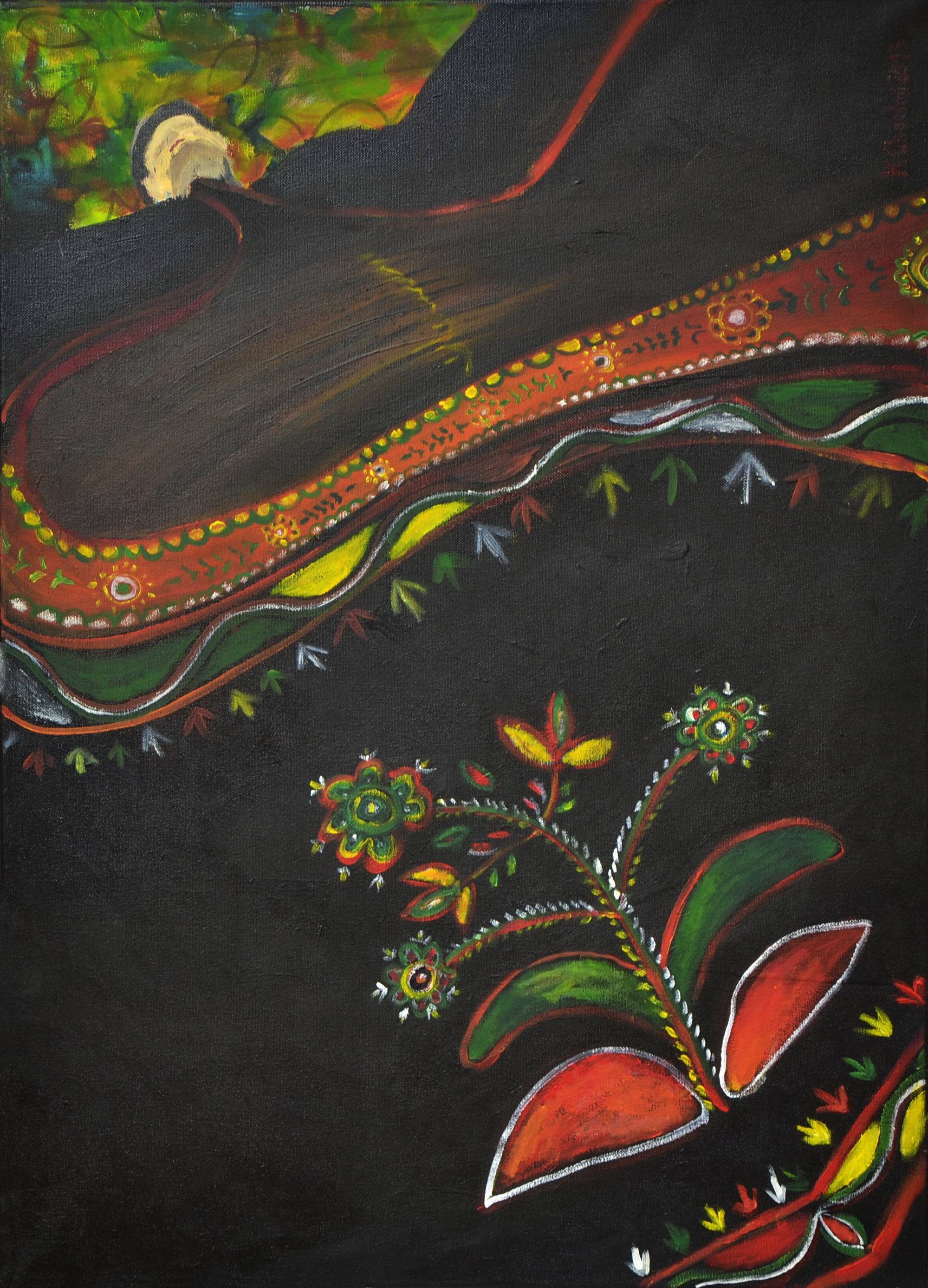 Obraz z cyklu Wariacje. Jest to cykl wariacji na temat wzornictwa pojawiającego się w tradycyjnych strojach ludowych.