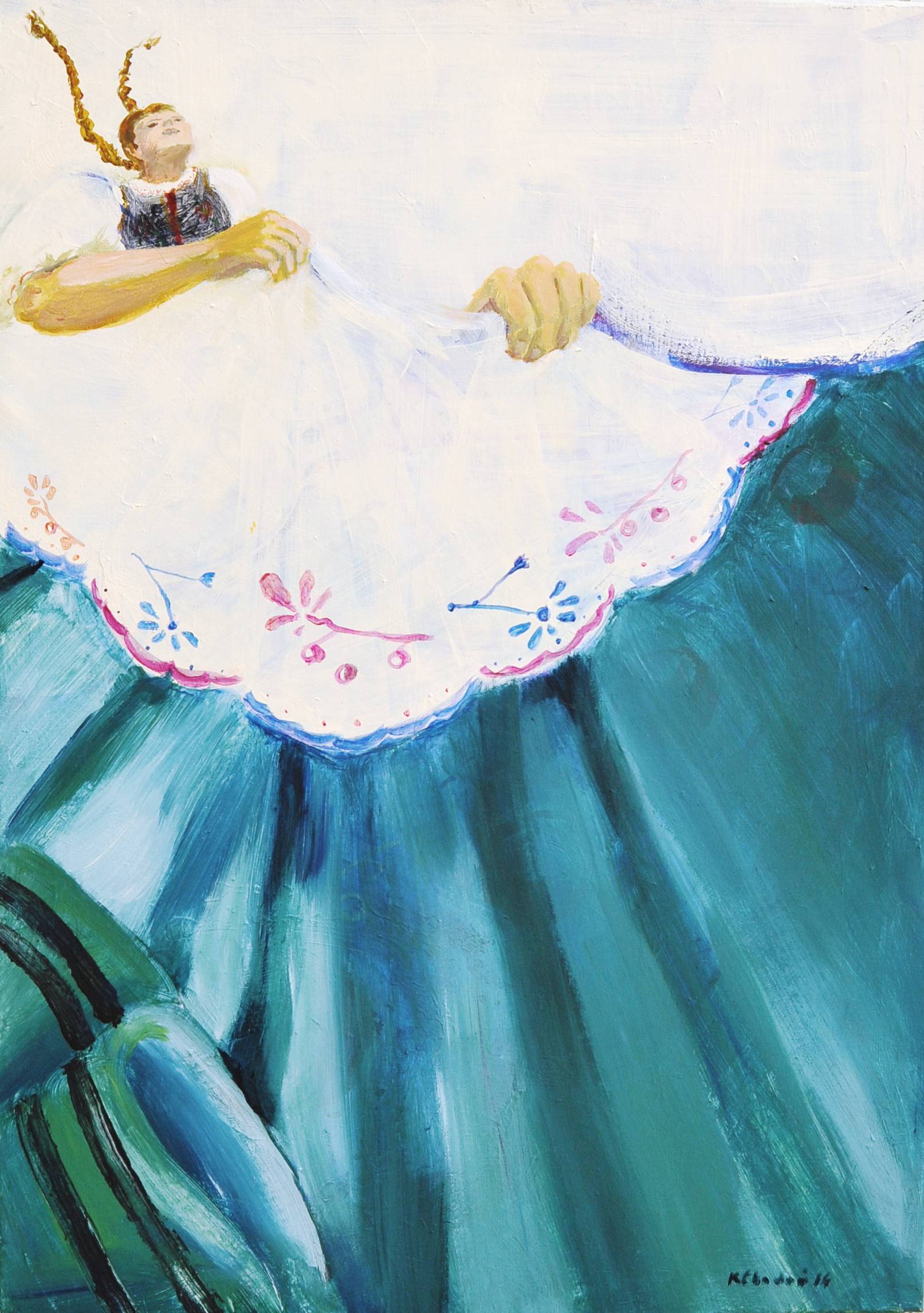 Obraz emanuje spokojem i delikatnością. Dominują tu jasne, pastelowe kolory, zwłaszcza biel i zieleń, które subtelnie ze sobą współgrają. Ręka kurczowo trzymająca cienką tkaninę spódnicy stanowi centralny punkt kompozycji, tworząc ciekawy kontrast z resztą elementów. Na dole widzimy niebiesko-zielone fałdy spódnicy, przypominające falujące morze. To jakby obraz opowiadał o ciepłym wspomnieniu lub chwili pełnej refleksji. Styl artysty jest niezwykle wyrazisty, co przejawia się w silnym pociągnięciach pędzla oraz mocnych, zdecydowanych konturach. Można dostrzec, że technika akrylowa dodaje mu głębii. Czuć tutaj subtelną grę światła i cienia, która wprowadza dodatkowy wymiar do całości. "Wow, co za piękne kolory!" powiedziałoby 7-letnie dziecko z zachwytem w oczach. Patrząc na ten obraz, czuje się delikatną nostalgię za chwilami, które minęły, ale wciąż są bliskie sercu. Ciężko oderwać wzrok od tej uroczej sceny, która zapada w pamięć. Całość wprowadza pozytywne "vibes", dając chwilę wytchnienia i spokoju. To dzieło, które potrafi rozbudzić uśmiech, będąc jednocześnie refleksyjnym i pełnym wewnętrznego uroku. Taki obraz to sama poezja barw, której aż chce się dotknąć i poczuć jej miękkość.