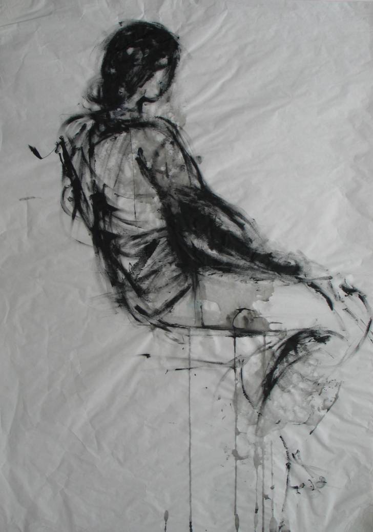Na obrazie widzimy subtelną, monochromatyczną kompozycję, która urzeka swoją prostotą i tajemniczością. Czarny tusz rozlewa się na białym tle, tworząc sylwetkę postaci siedzącej z boku. Kształty są niedokładne, trochę jakby artysta celowo zostawił je niedokończonymi, aby pobudzić wyobraźnię widza. Cienie tworzą delikatny efekt rozmycia, dodając uczucia nostalgii i melancholii. Całość emanuje spokojnym, nieco refleksyjnym nastrojem. Wydaje się, jakby postać była pogrążona w głębokiej zadumie, może wspomina coś z przeszłości. Technika tuszu, z widocznymi śladami rozmycia, dodaje jej pewnej efemeryczności. Można odnieść wrażenie, że postać za chwilę zniknie, jakby była tylko chwilowym odbiciem emocji. Obraz może wywołać w odbiorcy różnorodne emocje. Dla jednych będzie to spokój, dla innych smutek. Patrząc na tę pracę, czuję jakby mówiła: "każdy z nas ma chwile zadumy, gdy świat wokół przestaje istnieć". A może ktoś patrząc na ten obraz powie: "To wygląda jak chmurka". To jest właśnie magiczne touch sztuki - każdy zobaczy coś innego. I choć dzieło utrzymane jest w minimalistycznym stylu, jego emocjonalna głębia sprawia, że na długo zostaje w pamięci.