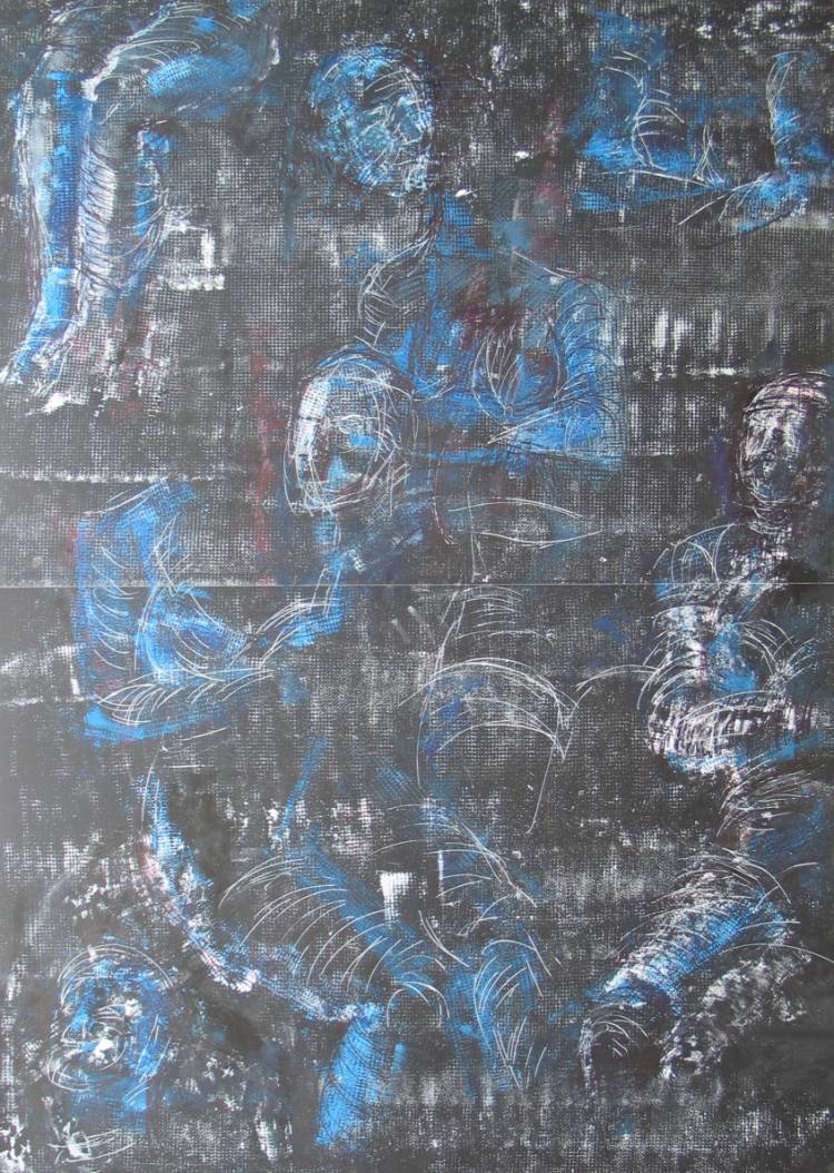 Obraz, który widzisz, to intrygujące połączenie ciemnych tonów i chłodnych, niebieskich akcentów. Głębokie czernie i szarości nadają całości tajemniczości, jakbyśmy zaglądali w głąb mrocznego snu. Niebieskie linie, niemalże fluorescencyjne, tworzą kształty ludzkich postaci, które zdają się być w ruchu, jakby w wirze nieskończonego tańca. Kompozycja jest rozedrgana, pełna dynamizmu, a jednak im dłużej się patrzy, tym bardziej wciąga. Atmosfera obrazu emanuje melancholią i jakąś niezwykłą tęsknotą. Można poczuć, że każdy kształt ma swoją opowieść, nieskończoną historię ukrytą między liniami. Styl artysty przypomina nieco ekspresjonizm, z wyraźnymi pociągnięciami pędzla i gwałtownymi liniami, które jakby chciały uciec poza granice obrazu. Skomplikowana faktura powierzchni sprawia, że chce się ją dotknąć, aby poczuć ten chaos pod palcami. Patrząc dłużej, obraz może wywołać chęć zatrzymania się, złapania oddechu w biegu codzienności. Dla dziecka mógłby być opisany jako obrazek, gdzie niebieskie duszki bawią się w ciemnym lesie. To pamiętajcie, it's all about emotion. Moje własne refleksje? Z ciekawością zaglądam w te niezrozumiałe wszechświaty i czuję, jak odpływam na chwilę.