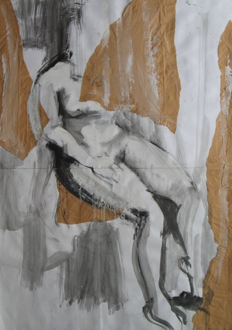 Obraz, na który patrzymy, zdaje się być wiecznym tańcem między światłem a cieniem. Dominują tu ziemiste, ciepłe brązy, przeplatające się z szarością i bielą, tworząc kompozycję, gdzie figura ludzka zdaje się rozpuszczać w abstrakcyjnej przestrzeni. Są tam plamy farby sprawiające wrażenie dynamicznego ruchu, jakby artysta pragnął uchwycić moment pełen ulotności. Atmosfera malunku jest nostalgiczna i nieco melancholijna, przypomina szeleszczące liście pod stopami w jesienny dzień. Styl przypomina coś jak poetycki expressionismus, w którym zanurzone są emocje i intuicja. Technika, z jaką wykonano obraz, sugeruje użycie pędzli i szpachelki, z odważnymi, szerokimi pociągnięciami, które niemalże można poczuć dotykiem. To art captivates, pozwala na chwilę zapomnieć o codzienności i zatrzymać się w zadumie. Dziecko powiedziałoby: "To wygląda, jakby ktoś się przewrócił i śmiesznie upadł!". Obraz ten, skierowany do odbiorcy, wydaje się pytać o kruchość i efemerę istnienia, pozostawiając nas z refleksją nad własnymi doświadczeniami i emocjami. W tym chaosie form jest coś niezwykle ujmującego, coś co woła "zastanów się, co tu widzisz", a my z chęcią to czynimy.