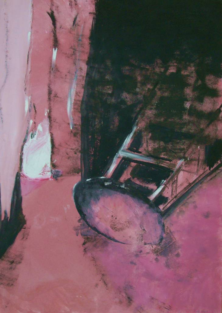 Obraz przyciąga wzrok swoją nieoczywistą kompozycją i intensywnymi kontrastami kolorystycznymi. Dominujący róż miesza się z ciemnymi plamami, które nadają całości tajemniczego charakteru. Kształty, geometryczne i nieco chaotyczne, wprowadzają element dynamiki. Patrząc na ten obraz, można poczuć pewien niepokój, jakby coś nieoczekiwanego miało się wydarzyć. Artysta zastosował technikę impresji, z naciskiem na abstrakcję, co nadaje dziełu intrygującą dwuznaczność i zachęca do własnej interpretacji. Przebijające się cienie, przypominające sylwetkę krzesła, budują nastrój niepewności i odosobnienia. Może masz ochotę zatrzymać się na chwilkę, poczuć zagadkę tego, co ukrywa się w mroku? Ciekawie jest, że w tej całej abstrakcji odczuwamy jakąś formę porządku. Obraz trochę jak zły sen, ale taki, który inspiruje do myślenia. Po angielsku można by to opisać jako "thought-provoking". Kolory trochę jak z bajki, prawda? W tej intensywności można odnaleźć piękno nawet w chaosie.