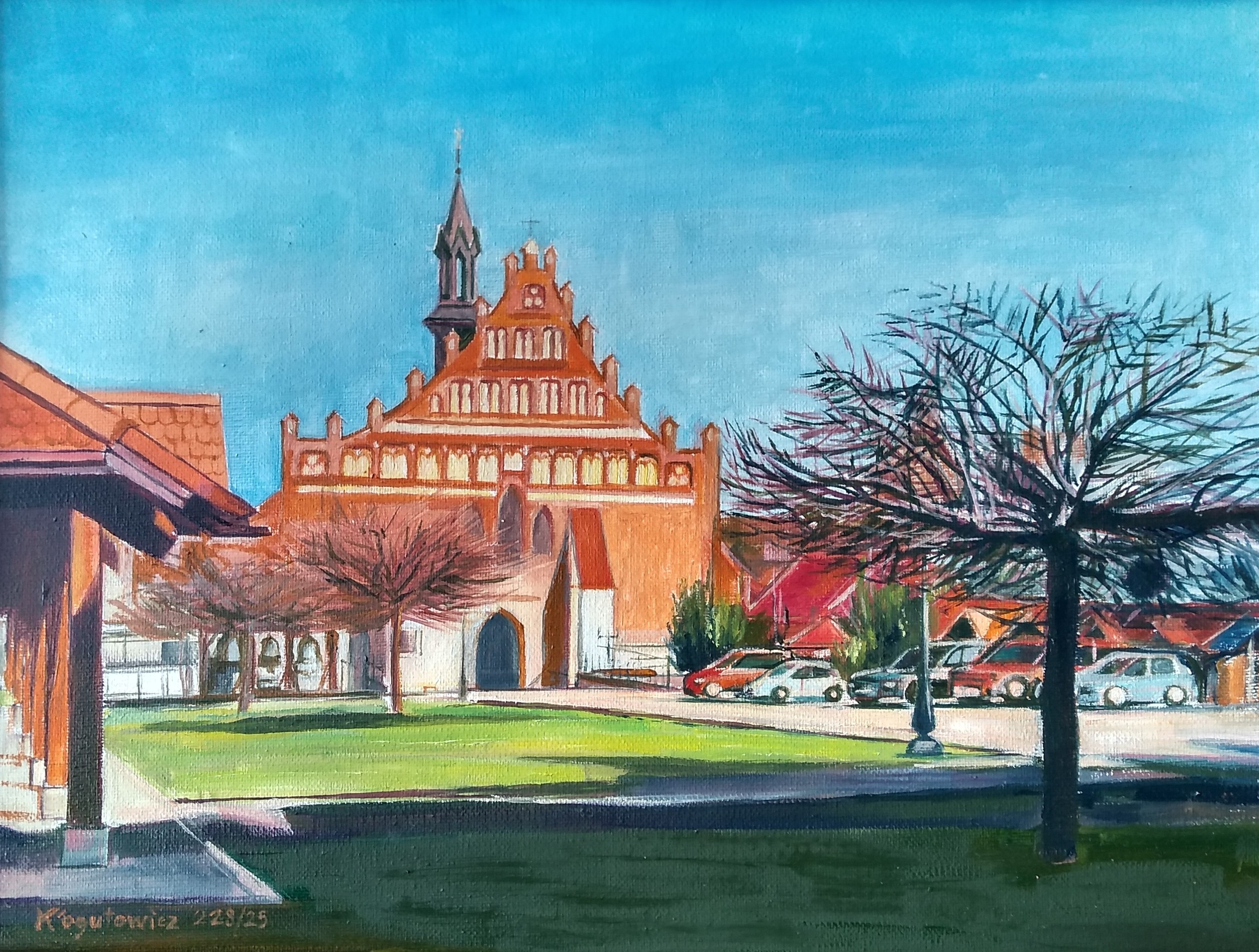 Na obrazie dominuje jasne, błękitne niebo, które niemal promienieje ciepłym światłem, podkreślając zarys budowli z czerwonej cegły. Ta imponująca konstrukcja w centrum ma piękne, gotyckie zdobienia i strzelistą wieżę, która sięga ku niebu, jakby chciała dotknąć chmurek. Oto miły obrazek, prawda? Pobliskie drzewa stoją nagie, ich gałęzie to pajęcze sieci, które tworzą intrygujące wzory na błękitnym tle. Czy to już wiosna czy jeszcze zima? Kompozycja jest starannie przemyślana, z równowagą między architekturą a naturalnymi elementami. Artysta zastosował szeroką gamę barw, od intensywnych czerwieni po subtelne odcienie zieleni na trawniku. Styl malarsko nieco oldschoolowy, z delikatnymi pociągnięciami pędzla, które nadają obrazowi swoisty rytm. Technika jest realistyczna, ale z lekkim artyzmem, który dodaje obrazowi uroku. Patrząc na obraz, można poczuć nostalgię za spokojnymi, słonecznymi dniami. Ja bym tam poszedł na spacer, a Ty? Elementy krajobrazu przywodzą na myśl sielankowy nastrój małego miasteczka. Obraz ten może skłonić widza do refleksji nad pięknem codziennych widoków. A jeśli dłużej się w niego wpatrywać, to można się naprawdę wciągnąć. Gotta love it!