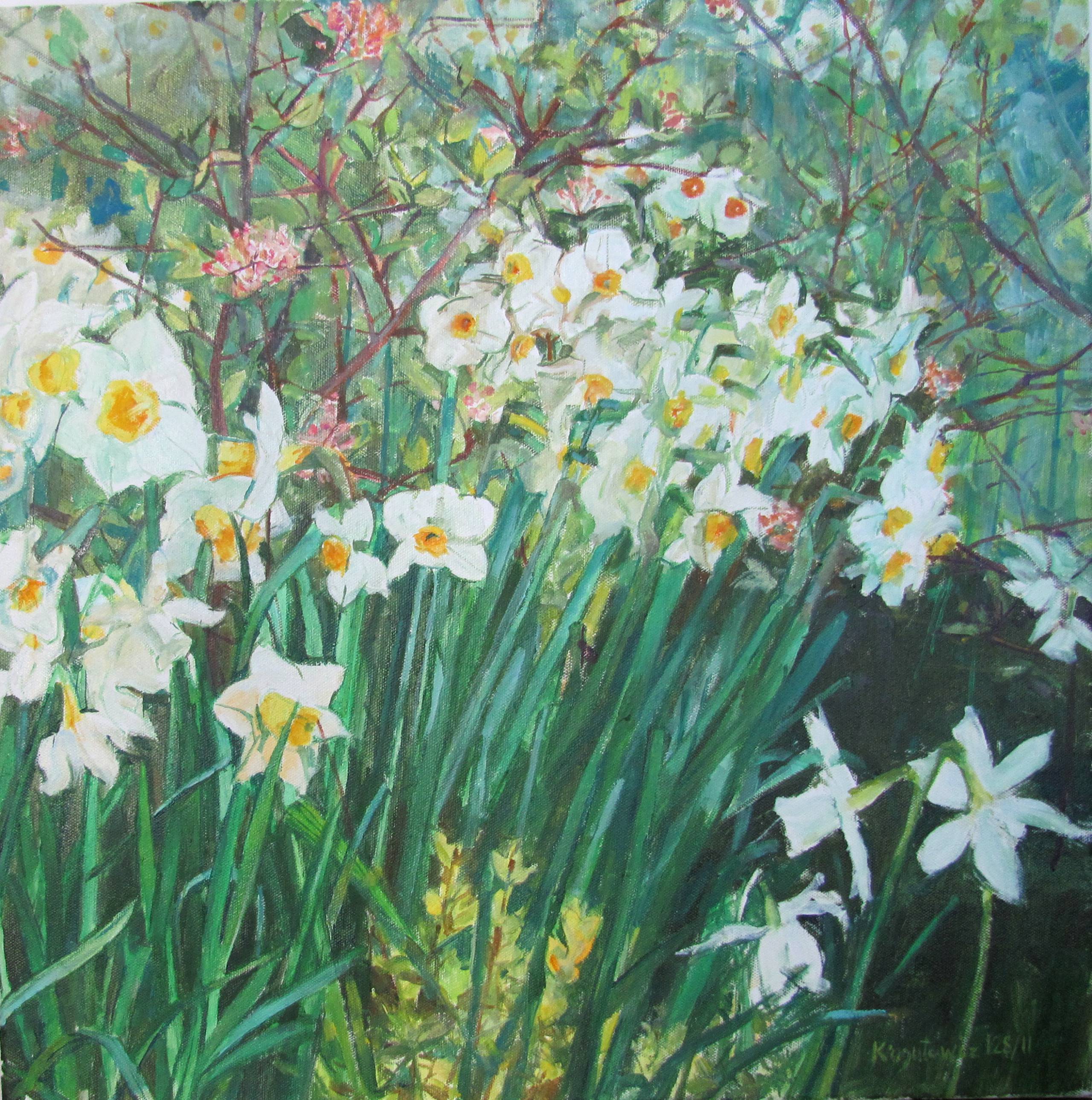 Ten obraz to prawdziwa eksplozja zieleni i bieli, gdzie narcyzy tańczą na tle bujnej roślinności. Kwiaty, pomalowane z niezwykłą precyzją, dominują w centralnej części dzieła, a ich płatki mienią się różnymi odcieniami, od śnieżnobiałych po delikatnie żółte środki. Gałęzie w tle, pomalowane bardziej swobodnie, dodają kompozycji głębi i przestrzenności. Atmosfera obrazu jest pełna spokoju i świeżości, jak pierwszy wiosenny dzień, kiedy wszystko budzi się do życia. Artysta z wykorzystaniem impresjonistycznych technik starał się uchwycić chwilę, co widać po dynamicznych pociągnięciach pędzla i żywych barwach. To dzieło wprost wywołuje uśmiech na twarzy. Czujesz, jakbyś niemal mógł dotknąć miękkich płatków. Dziecko powiedziałoby: „Kwiatuszki pachną!”, a taki bezpośredni język tylko dodaje uroku temu doświadczeniu. Ta mieszanka kolorów i form jest jak harmony w muzyce – coś, co trafia prosto do serca. Obraz może budzić nostalgię za chwilami spędzonymi na łonie natury, gdzieś daleko od miejskiego zgiełku. Patrząc na to dzieło, czujesz freedom, wolność i beztroskę, którą daje kontakt z naturą. To jak ucieczka do świata pełnego harmonii i piękna.
