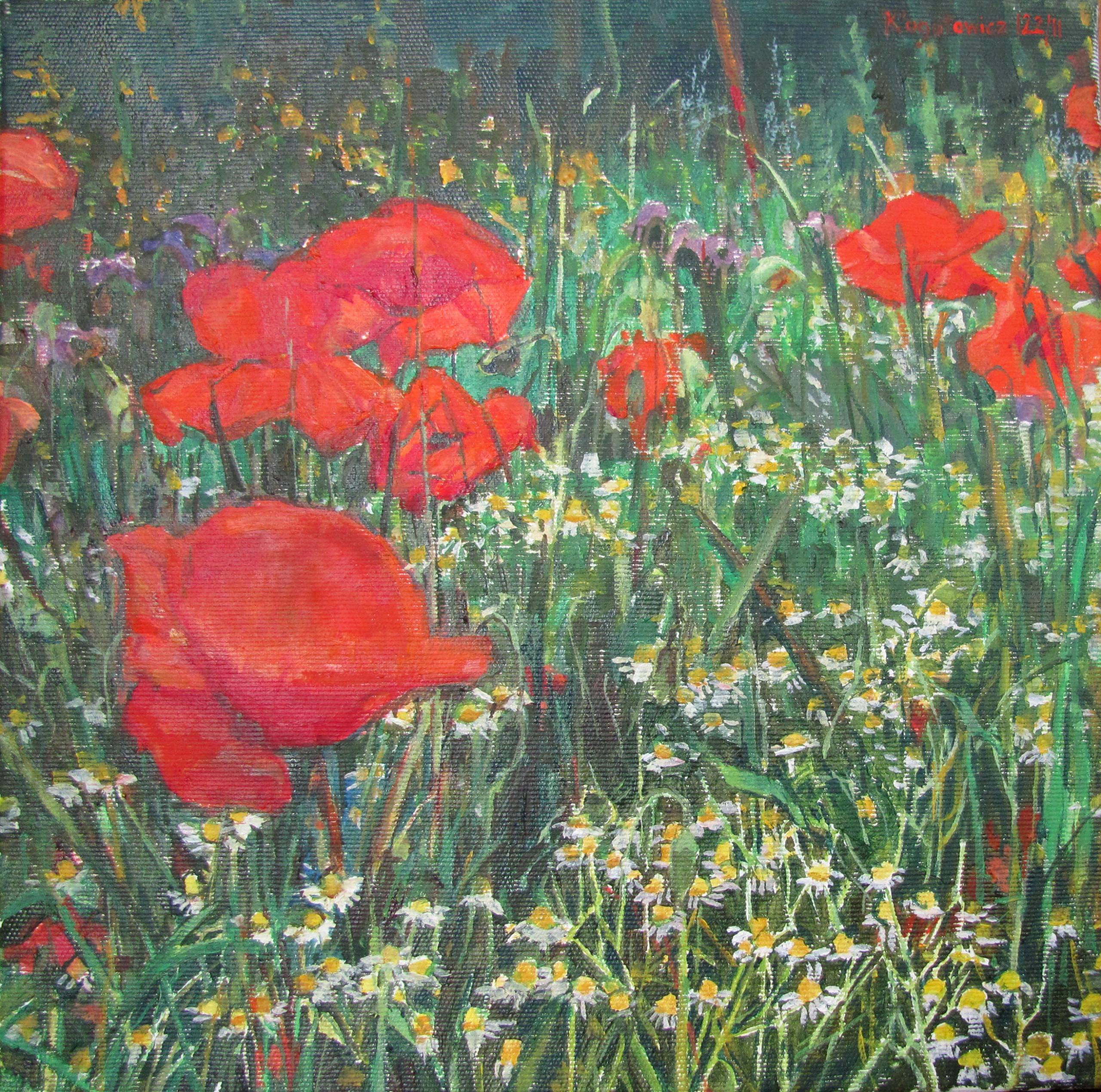 Na obrazie widzimy wybuch kolorów, w którym czerwone maki dominują nad resztą kompozycji. Są jak żywe ognie na tle zieleni, wypełnionej delikatnymi rumiankami i subtelnymi fiołkowymi akcentami. Feeria barw przyciąga wzrok i sprawia, że czujemy, jakbyśmy stali na środku łąki, gdzie wiatr lekko porusza kwiaty. Atmosfera jest magiczna i pełna życia. Obraz emanuje spokojem, choć kontrastujące kolory przynoszą energię. Artysta zastosował technikę impasto, co pozwala niemal poczuć fakturę płatków dotykiem. Pociągnięcia pędzla są dynamiczne, co dodaje dziełu głębi. Stylem nawiązuje do impresjonizmu, ale z odrobinką współczesnego twistu. To taki magiczny moment "wow", który wywołuje uśmiech na twarzy. Na mnie osobiście działa jak balsam dla duszy. Czyż nie jest to idealne miejsce na drzemkę? Stylistycznie obraz prowokuje do zastanowienia się nad pięknem i ulotnością natury. Bright red maki, tak intensywne i jednocześnie delikatne, przyciągają uwagę, styl artysty sprawia, że czujesz, że te kwiaty prawie mówią. A dziecko powiedziałoby: "Te kwiatki są jak w bajce!" Interesujące, jak jedno dzieło może tyle w nas wzbudzać.