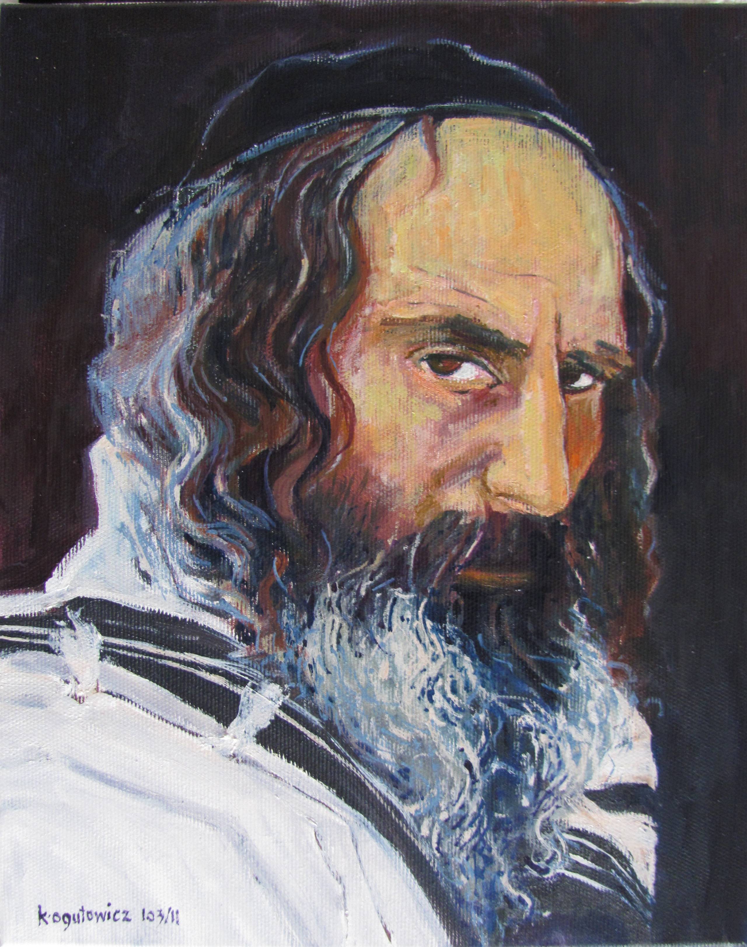 Obraz ten jest niezwykle fascynujący i pełen intensywności. Dominują na nim ciemne odcienie, które przeplatają się z ciepłymi barwami. W centrum znajduje się postać z długą, siwiejącą brodą i głęboko patrzącymi oczami. Wyraz twarzy sugeruje skupienie i introspekcję, jakby artysta pragnął uchwycić moment głębokiego zamyślenia. Kolory są nałożone z odwagą, a tekstura pociągnięć pędzlem dodaje dziełu dynamiki. Można dostrzec wyjątkową technikę impasto, gdzie grube warstwy farby tworzą niemalże trójwymiarowy efekt. Atmosfera obrazu jest jednocześnie spokojna i pełna napięcia, intrygująca odbiorcę. Czuje się tu echo tradycji i kultury, a oczy postaci zdają się opowiadać niejedną historię. Obraz ma w sobie coś dramatic, co przyciąga wzrok i nie pozwala przejść obojętnie. To jest takie fajne. Dzieło to może budzić różnorodne emocje — od zadumy nad przemijaniem czasu po refleksję na temat ludzkiej natury. Patrząc na ten obraz, można poczuć, jak zmienia się bieg myśli, a artystyczna wizja przenosi nas w inny wymiar rzeczywistości. To niesamowite, jak niewielka rzecz, jak jeden obraz, potrafi wzbudzić tyle uczuć i wprawić w taki nastrój.