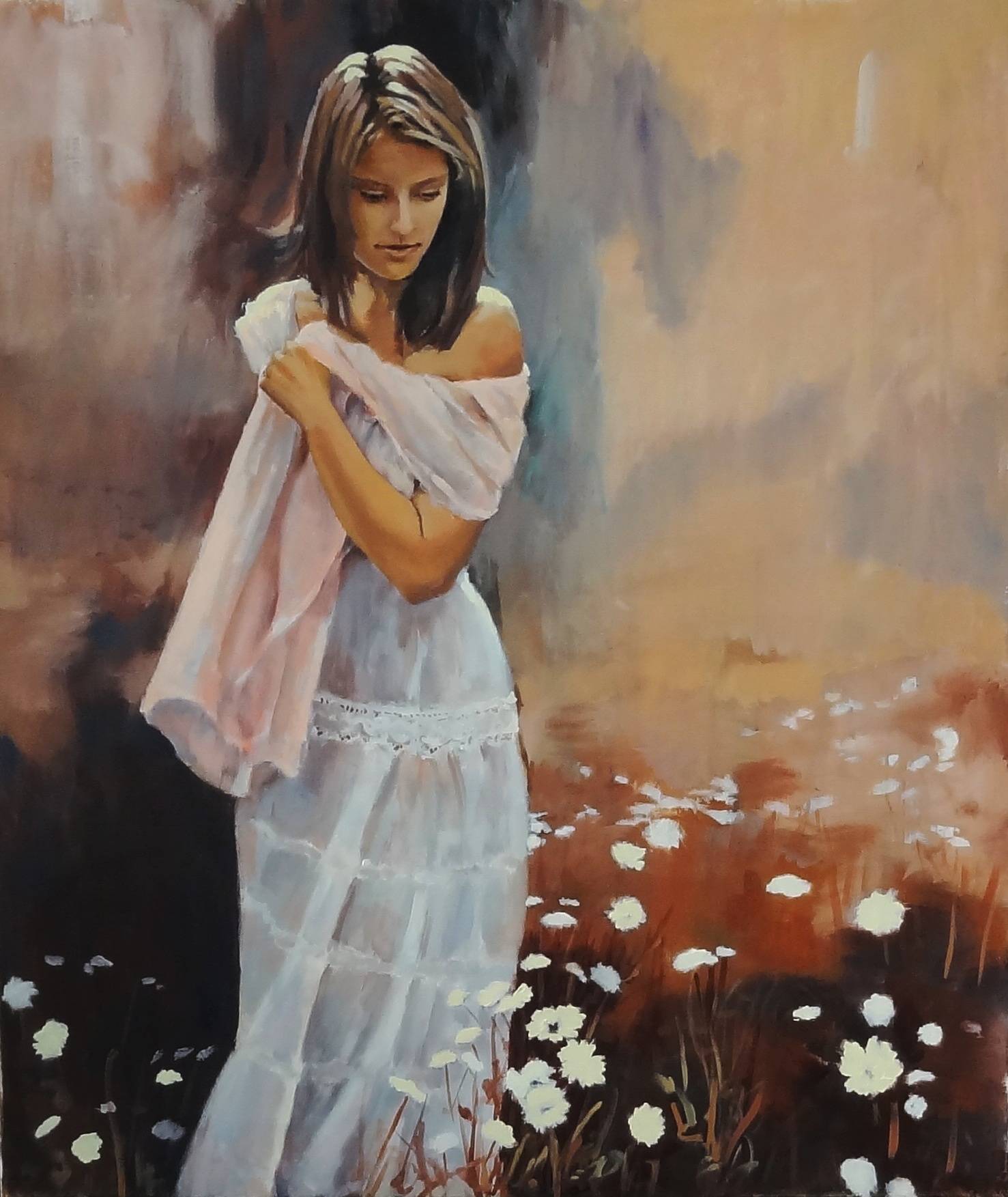 Na obrazie widzimy młodą kobietę opatuloną jasnym szalem, lawirującą wśród polnych kwiatów. Dominują subtelne odcienie brązów i bieli, które tworzą ciepłą, niemal nostalgiczną atmosferę. Kompozycja jest spokojna, z wyraźnym centrum w postaci postaci kobiety. Czuje się tu ciszę i spokój. Delikatne pociągnięcia pędzla nadają teksturę, sprawiając, że tkanina sukienki wydaje się niemalże prawdziwa. Artysta korzysta z mieszanki realizmu i impresjonizmu, co dodaje dziełu lekkości i dream-like quality. Dzieło przyciąga wzrok, zmuszając do zatrzymania się choć na chwilę. Wywołuje w widzu poczucie tęsknoty za czymś nieuchwytnym, może za latem czy niewinną młodością. "Ma taką ładną sukienkę!" mógłby powiedzieć zachwycone dziecko. Osobiście poczułem spokój, jakby wszystkie troski świata rozpłynęły się gdzieś w tle obrazu. Ten malarski kawałek sztuki jest jak okruch piękna, zostawiony w zagonionym świecie, przypomina o prostych momentach szczęścia.