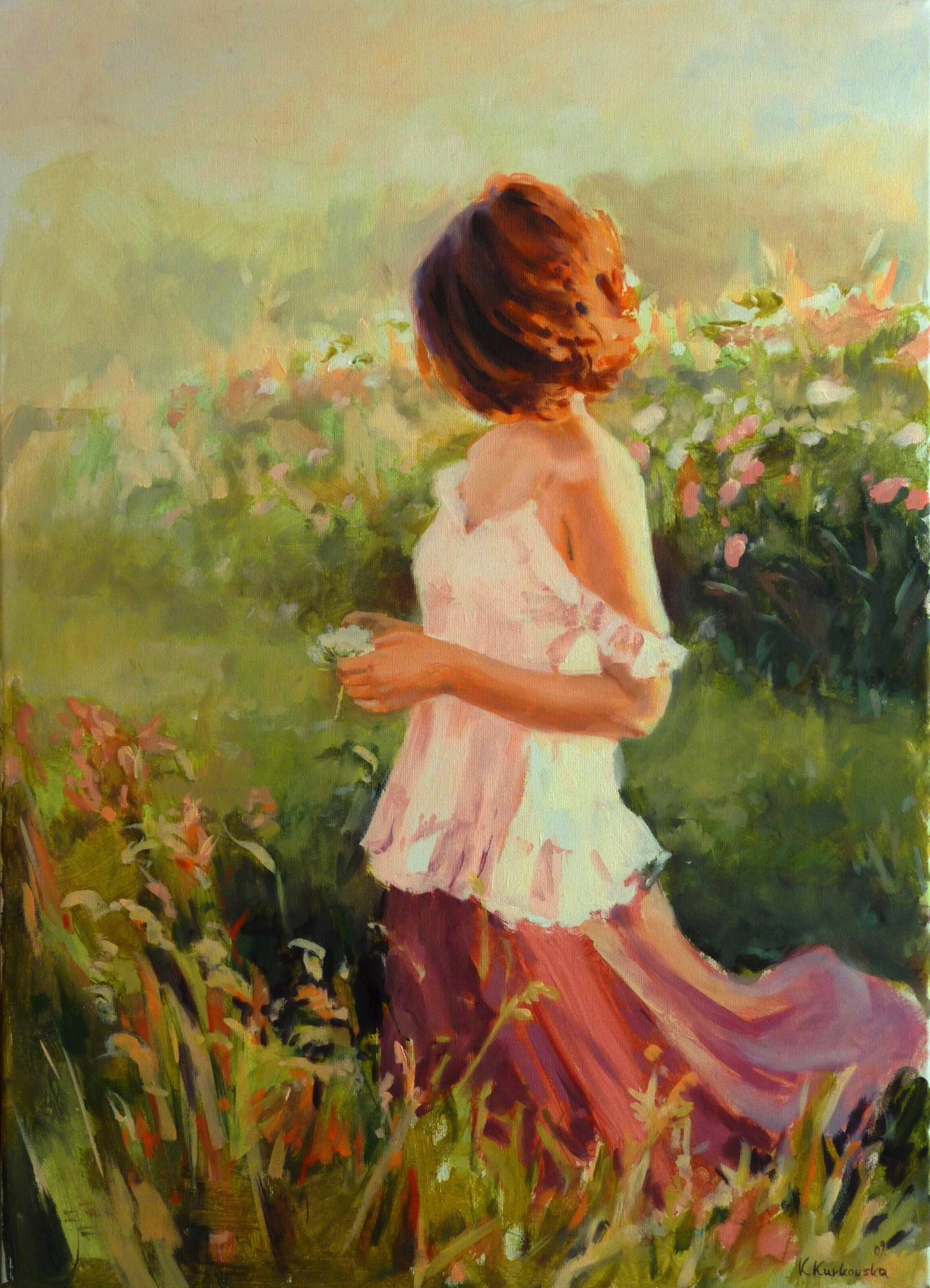 Obraz emanuje spokojem i delikatnością, przedstawiając kobietę w jasnej sukience, zanurzoną w morzu zieleni. Pastelowe kolory użyte przez artystę przyciągają wzrok, tworząc ciepłą, nostalgiczną atmosferę. Kompozycja jest zamglona, ale wcale nie traci przejrzystości. Wyraziste pociągnięcia pędzla dodają tekstury i głębi, przez co niemal czuć zapach kwiatów. Technika ta nadaje dziełu impresjonistyczny charakter. Ktoś patrzący na ten obraz może poczuć spokój, a nawet tęsknotę za beztroskimi chwilami dzieciństwa. Malarskie "brushstrokes" składają się na sentymentalną opowieść o ulotnych momentach. Hej, mam pomysł, to miejsce wygląda jak z bajki, tak mówiłoby dziecko. Patrząc na to dzieło, odnajduję w nim sielankową prostotę. Jest coś magicznego w sposobie, w jaki artysta oddał światło igrające na jej włosach. Obraz prowokuje do refleksji nad przemijaniem i pięknem codzienności.