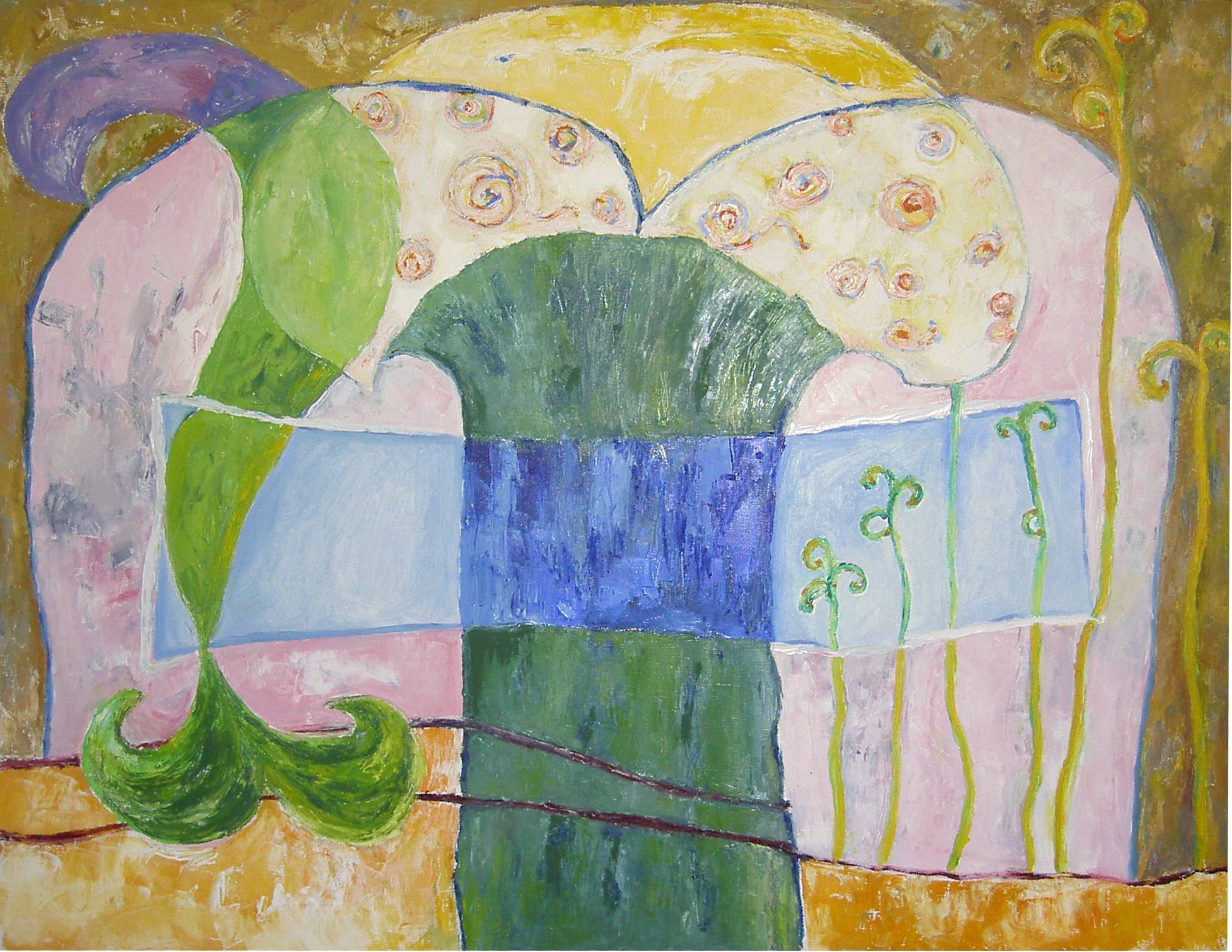 Na obrazie dominują miękkie, pastelowe odcienie zieleni, różu i błękitu, które płynnie przechodzą w siebie, tworząc harmonijną kompozycję. Kształty są abstrakcyjne, przypominają miksturę roślinnych form – to wygląda jak senne, idylliczne krajobrazy. Artysta zastosował styl bliski ekspresjonizmowi, z widocznymi, swobodnymi pociągnięciami pędzla, co dodaje dziełu dynamiki i życie. Mimo swojej abstrakcji, obraz emanuje spokojem i delikatnością, niczym szept w ciepły, wiosenny dzień. Niektóre elementy wydają się być ozdobione spiralami, które potęgują uczucie ruchu. Prace te przypominają dziecięce marzenia, są tak proste i piękne. Ten artystyczny chaos ma coś w sobie z freedom typowego dla dzieł impresjonistycznych, ale jednocześnie zawiera coś z baśniowego klimatu snu. Patrząc na ten obraz, można poczuć tę dziwną mieszankę radości i refleksji nad naturą świata. Ah, jak fajnie by było żyć w takim świecie, gdzie wszystko jest łagodne i płynne. Może takie obrazy uczą nas patrzenia na rzeczy z innej perspektywy? Może to tylko malarska opowieść o tęsknocie za harmonią, której nam brakuje.
