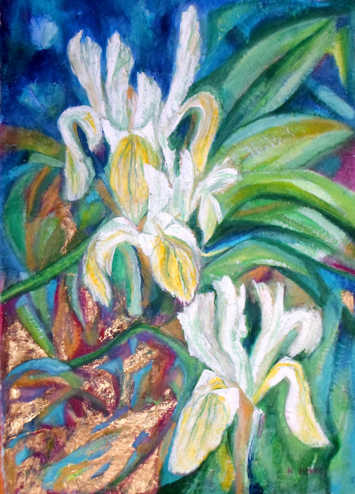 Technika własna, obraz namalowany na papierze czerpanym, z elementami złoconymi.