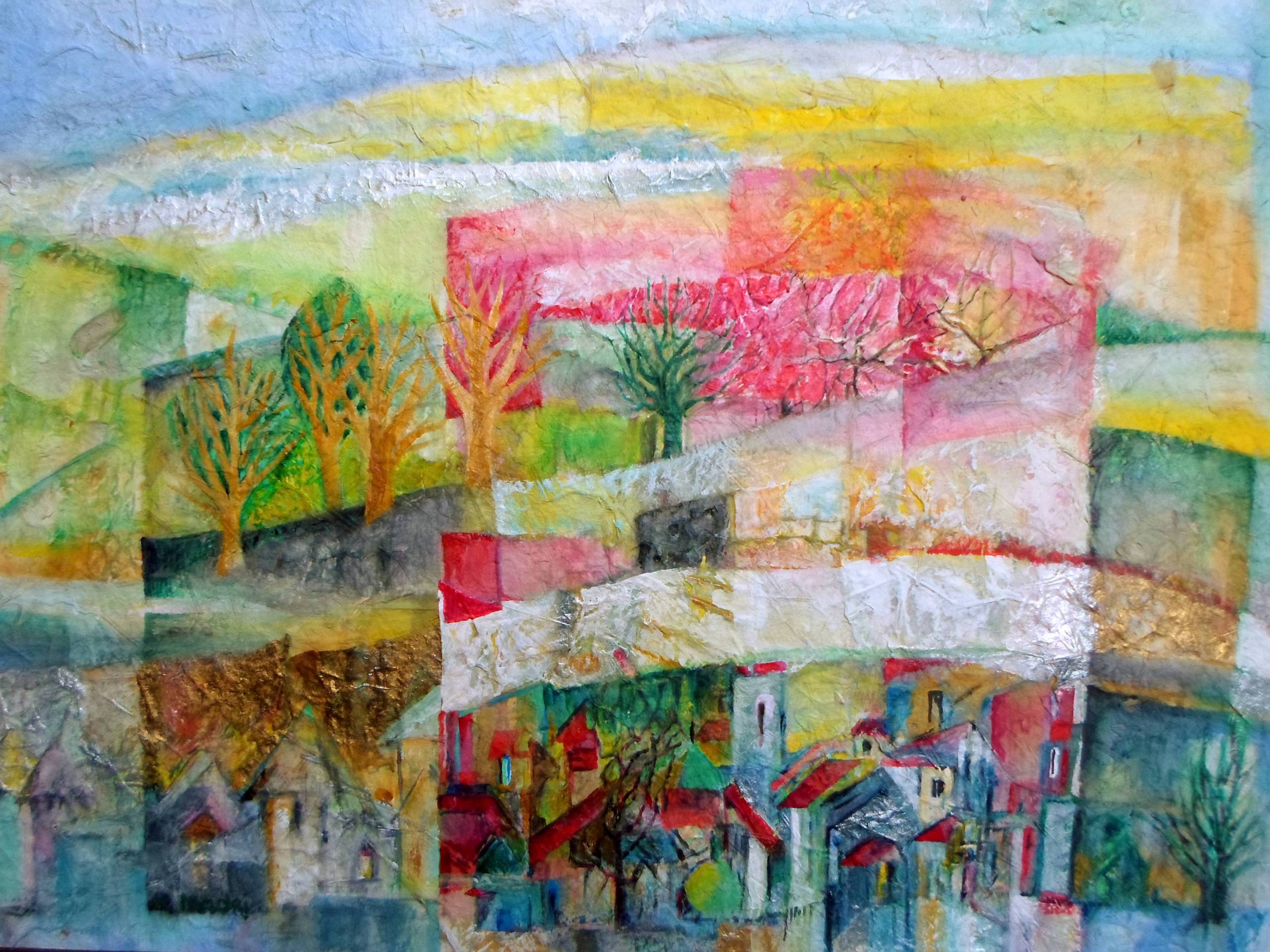 Obraz namalowany na papierze czerpanym, naklejony na blejtram .Posiada białe paspartu około 5 cm.