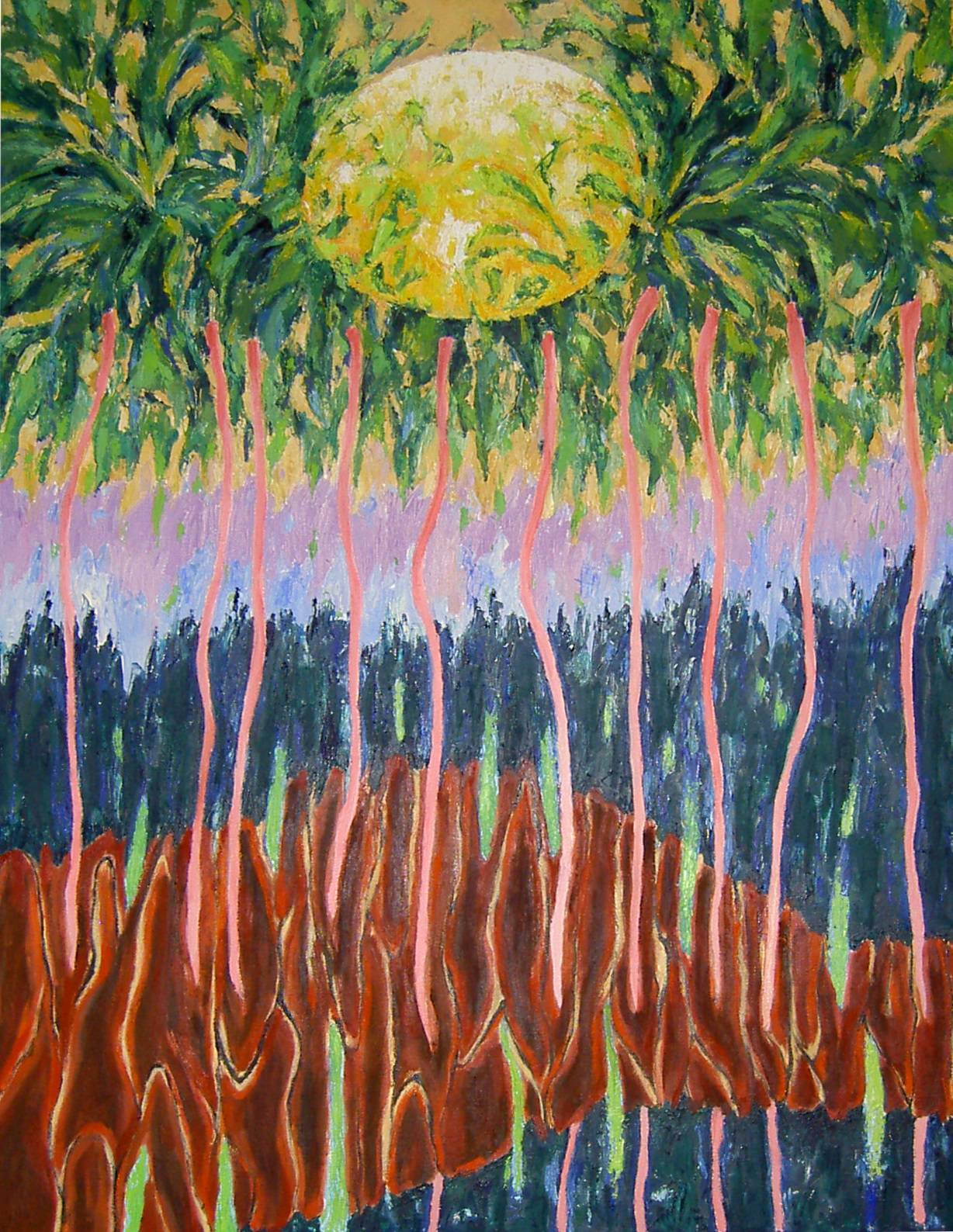Obraz emanuje eksplozją kolorów i dynamicznych kształtów. Kontrastujące zestawienie zieleni i żółci tworzy tajemniczy klimat lasu, gdzie centralny element – duży, jasny krąg przypomina słońce lub księżyc w pełni. Niebieskie i fioletowe tony w tle nadają głębi kompozycji. Palmy, wyciągające swoje pnie w górę, zdają się przeskakiwać między rzeczywistością a snem, pulsując energią natury. Atmosfera jest niemal mistyczna, jakby cała scena działo się w magicznym świecie. Technika, jaką posłużył się artysta, łączy w sobie impresjonistyczne pociągnięcia pędzla z subtelnością abstrakcji. To mix emocji – od radości po melancholię. Obraz, niczym "window" do innej rzeczywistości, pulsuje własnym rytmem, prowokując do refleksji nad siłą przyrody. Dziecko stwierdziłoby: "To wygląda jak las z innej planety!". Każdy element zdaje się mieć swoją historię, do której można dopisać własny rozdział. Niechętnie odchodzi się od tego obrazu, bo jego kolory i forma wciągają jak magnes, zostawiając widza z niezaspokojoną chęcią odkrywania więcej.