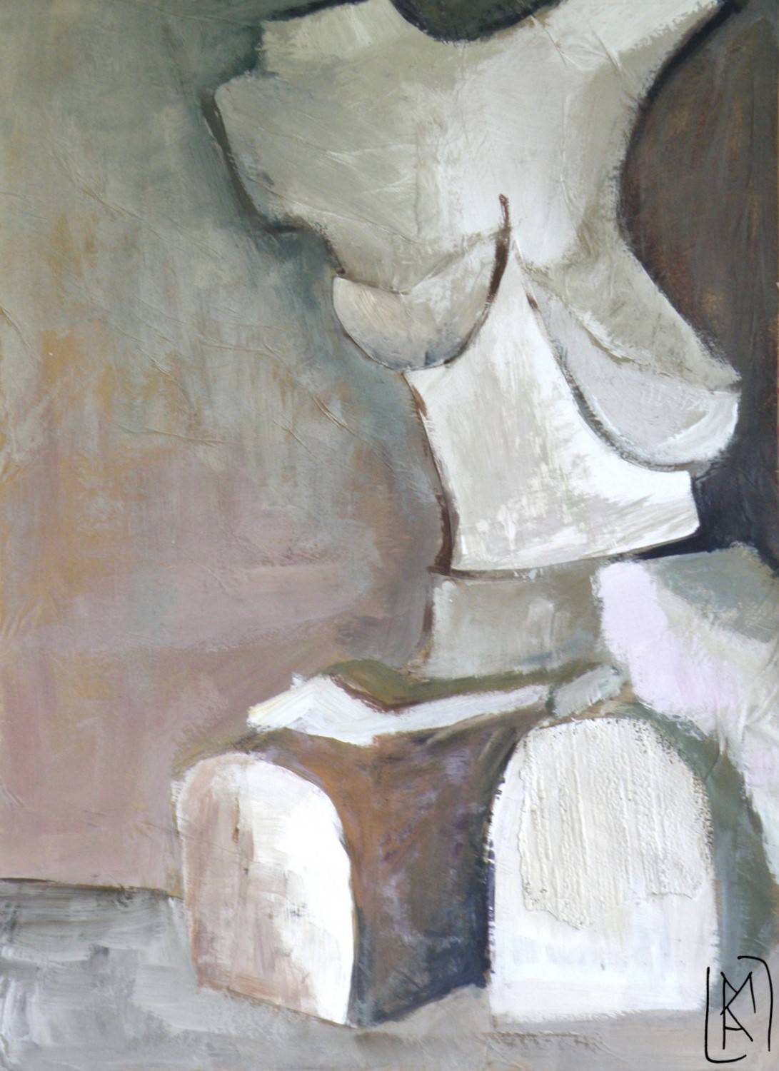 Na obrazie dominują stonowane, ziemiste kolory z subtelnymi odcieniami szarości i bieli. Kształty są geometryczne, mocno zarysowane, co dodaje miejscu nutę abstrakcji. Kompozycja jest statyczna, przywodząca na myśl klasyczne rzeźby, jednak z nutką surrealizmu. Wygląda trochę jakby artysta bawił się fakturą i formą, tworząc dzieło pełne kontrastów. Nastrój jest spokojny, można nawet rzec melancholijny. Ta cisza artystyczna emanuje z dzieła i przenika do widza, wciągając go w świat refleksji. Techniki użyte przez artystę przypominają oleje, z delikatnym światłocieniem, który tworzy wrażenie głębi i przestrzeni. Obraz może wywoływać różnorodne emocje. Jedni zobaczą w nim piękno niedoskonałości, inni poczują nostalgiczne przypomnienie minionych czasów. Dla mnie to trochę jak spojrzenie w głąb siebie, gdzie chaos i spokój współistnieją. Te shapes na obrazie przypominają mi puzzle, które próbuję złożyć w głowie. Myślę, że artysta czerpał inspirację z klasyki, ale z nowoczesnym twistem. Można poczuć tę harmonię między tradycją a nowoczesnością. Jak się zastanowisz, to jest w tym coś magicznego. Jakby zapisał kod czasu w kolorach i formach. A moje myśli biegają z jednej strony obrazu na drugą. Podoba mi się to, bo jest tu miejsce na indywidualne odczucia każdego z nas.
