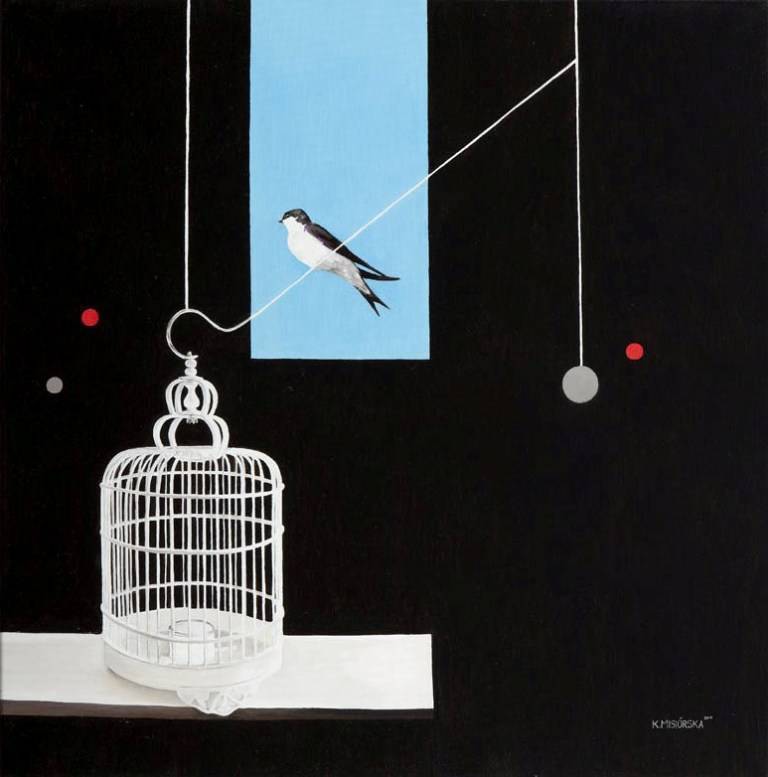 Obraz przedstawia minimalistyczną scenę z jaskółką na tle kontrastujących kolorów. Czerń dominująca w tle sprawia, że błękit prostokąta przyciąga wzrok, a biały ptak wydaje się niemal luminescencyjny. Kluczowym elementem jest biała klatka na pierwszym planie, na szczęście pusta. Artysta bawi się geometrią: proste linie i kule tworzą zagadkowy rytm, a te małe czerwone kropki? Na pewno coś symbolizują. Atmosfera obrazu jest nieco melancholijna, ale jednocześnie intrygująca, jakby „freedom” miała konkretne znaczenie tutaj. Styl artystyczny jest prosty, z oddaniem szczegółów w minimalistyczny sposób. Może techika akrylowa? Tak mi się wydaje. Emocjonalnie obraz wpływa różnie: niektórzy widzą w nim wolność, inni - ulotność chwili. Dzieci pewnie powiedziałyby "Ptak lata i jest wolny" i miałyby rację. Ta jaskółka jak królowa nieba wyzwala w widzu nostalgiczne refleksje o niezależności. Ciekawe, czy artysta często patrzy w niebo?