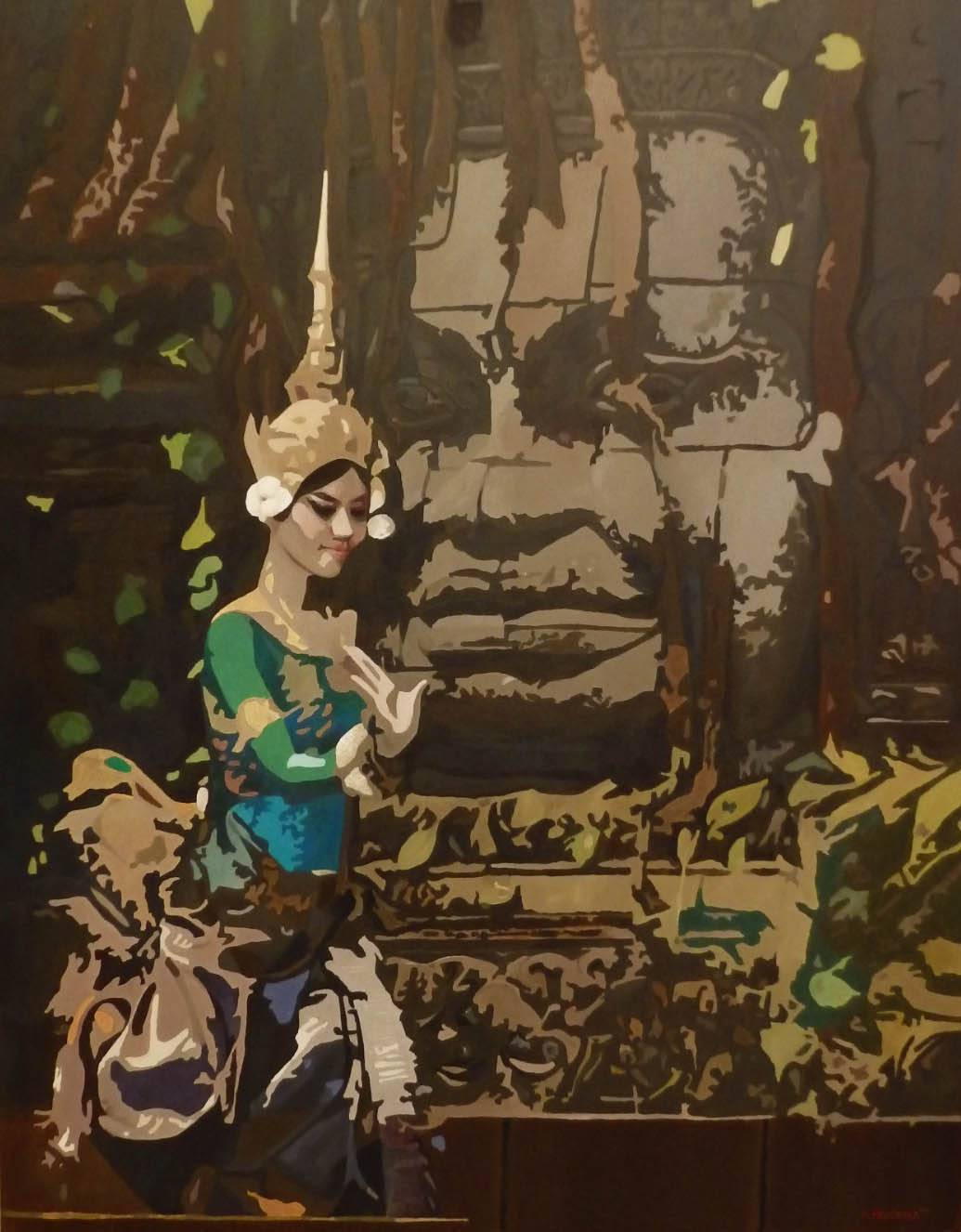 Obraz przedstawia tajemniczą scenę pełną kontrastów i detali, które przyciągają wzrok. Dominują tu ciemne odcienie brązu i zieleni, rozjaśnione tu i ówdzie przez błękitną i złotą barwę stroju postaci. Kompozycja tchnie spokojem, jakby czas zatrzymał się w tym miejscu. W centrum widzimy postać w tradycyjnym stroju i bogato zdobionym hełmie, który jest niezwykle ozdobny. Tuż za nią monumentalna rzeźba o surowej, kamiennej fakturze. Atmosfera jest wręcz magiczna, mieszanką historii i mistycyzmu. Jest coś takiego, co sprawia, że patrząc na to dzieło, czujemy delikatny powiew przeszłości. Techniki użyte przez artystę wskazują na grę światłem i cieniem, co dodaje głębi. To wszystko sprawia, że obraz może budzić różne emocje - od zadumy po spokojną refleksję nad pięknem sztuki. "Kiedy patrzę na ten obraz, czuję jakbym sam przeniósł się do tamtych czasów" - to echo myśli, z którymi wychodzisz po chwili kontemplacji. To właśnie magic, który tkwi w tego rodzaju twórczości. Jak powiedziałby 7-latek: "To wygląda jak z bajki!" Całość uderza w stronę mistycyzmu i odkrywania nieznanego.