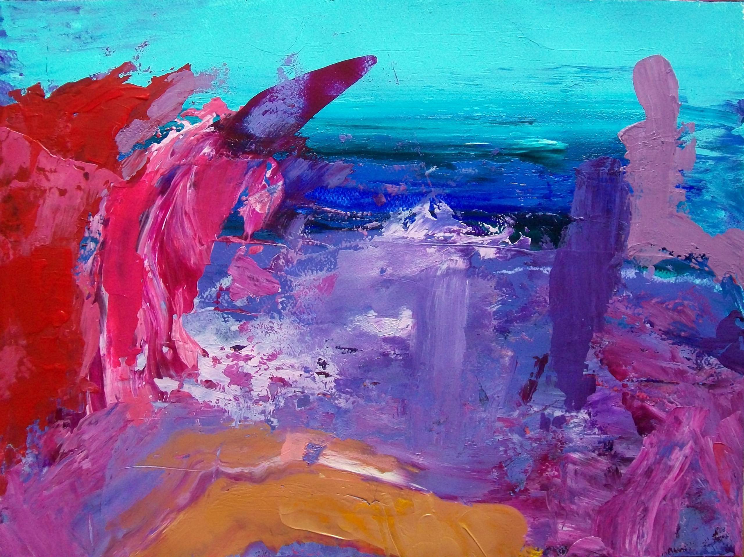 Obraz emanuje intensywnymi kolorami, które od razu zwracają uwagę. Dominują turkusy, głębokie błękity, odcienie różu i fioletu, które tworzą dynamiczną kompozycję. Wiszące pociągnięcia pędzla, przypominające falujące morze, kontrastują z plamami żywego czerwieni i żółci. W tej abstrakcji widzimy balans między chaosem a harmonią. Nastrój obrazu jest intensywny, niemal elektryzujący. Wywołuje uczucie, jakby patrzyło się na taniec żywych kolorów. Czuję się, jakby te barwy miały swoje własne życie. Styl artystyczny jest wyraźnie ekspresjonistyczny – pociągnięcia pędzla są odważne i nieco chaotyczne, co dodaje dziełu energii. Obraz może wzbudzać różnorodne emocje – od radości po zadumę. To zależy od odbiorcy, ale każdy znajdzie w tym chaosie coś swojego. "Kolory są jak krzyki," pomyśli małe dziecko. No i tyle. Artysta zastosował techniki gesturalne, co dodaje surowości i autentyzmu. To jakby nature painting, gdzie barwy są w stanie uchwycić emocje chwili. Osobiście czuję, że obraz tętni życiem. Przypomina mi beztroskie chwile spędzone nad morzem, kiedy słońce zachodzi, a świat staje się magiczny. Te wszystkie kolory tworzą własną opowieść, którą każdy może odczytać na swój sposób.