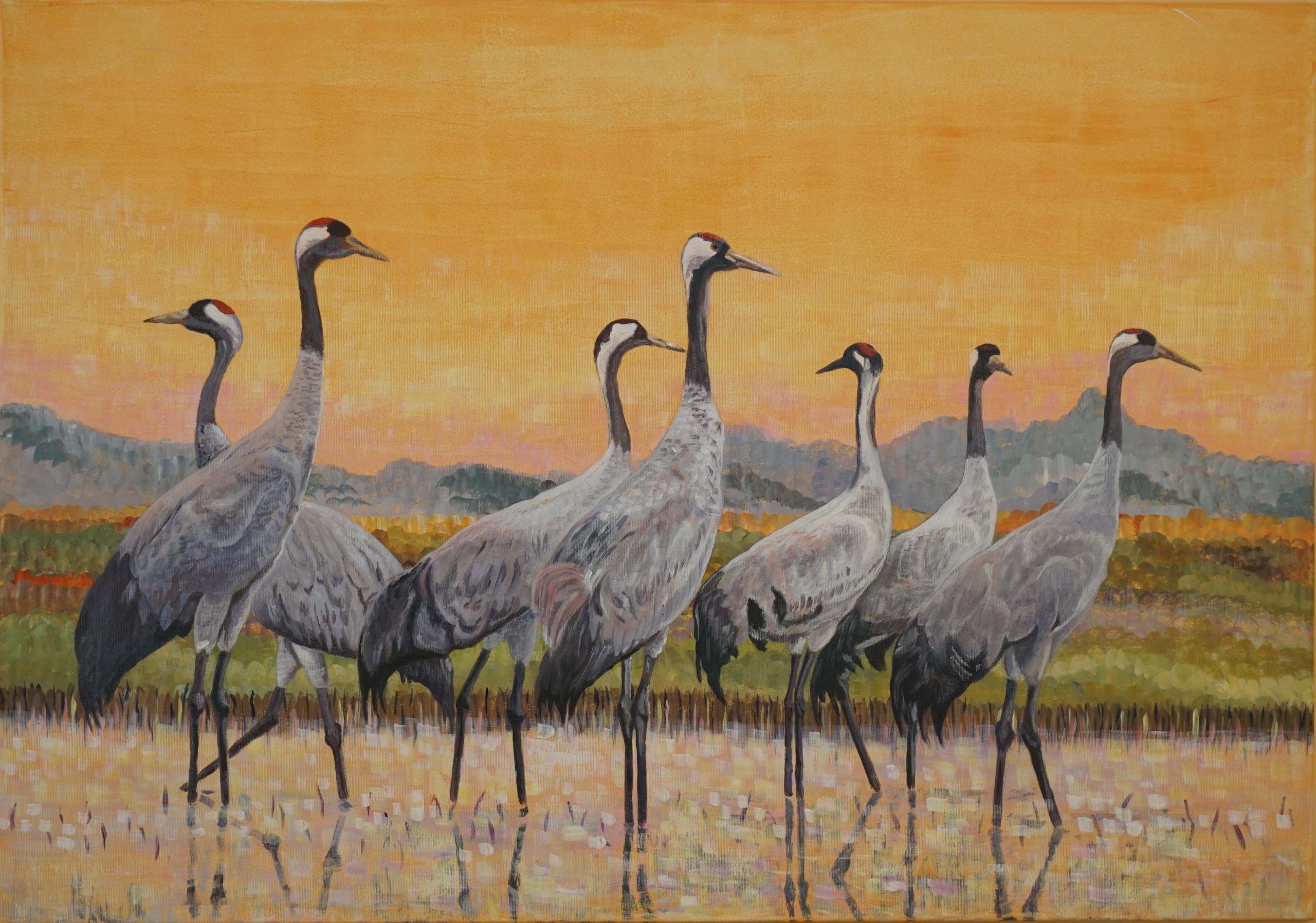 Obraz przedstawia grupę majestatycznych żurawi, stojących na tle nieba, które mieni się ciepłymi odcieniami pomarańczu i żółci. Ich smukłe sylwetki są podkreślone przez jasne promienie zachodzącego słońca, które odbijają się w spokojnej wodzie poniżej. Ta harmonijna kompozycja tworzy atmosferę spokoju i kontemplacji, jakby czas się zatrzymał na chwilę. Artysta zastosował technikę malarską, która łączy delikatne pociągnięcia pędzla z subtelnymi przejściami kolorów, nadając płótnu lekkości i dynamiki. Patrząc na to dzieło, można poczuć się jakby się tam było, w ciszy przerywanej tylko szumem natury. Styl jest realistyczny, ale z nutą impresjonizmu, co dodaje mu magicznej aury. Żurawie zdają się być w ruchu, jakby zaraz miały wznieść się w przestworza. Wow, one naprawdę są piękne! Obraz może wywołać w widzu refleksje nad ulotnością chwili i pięknem natury. To uczucie, English word "serenity", doskonale oddaje nastrój płynący z tej sceny. Personalnie, patrząc na te żurawie, czuję spokój i tęsknotę za przebywaniem w dzikiej przyrodzie.
