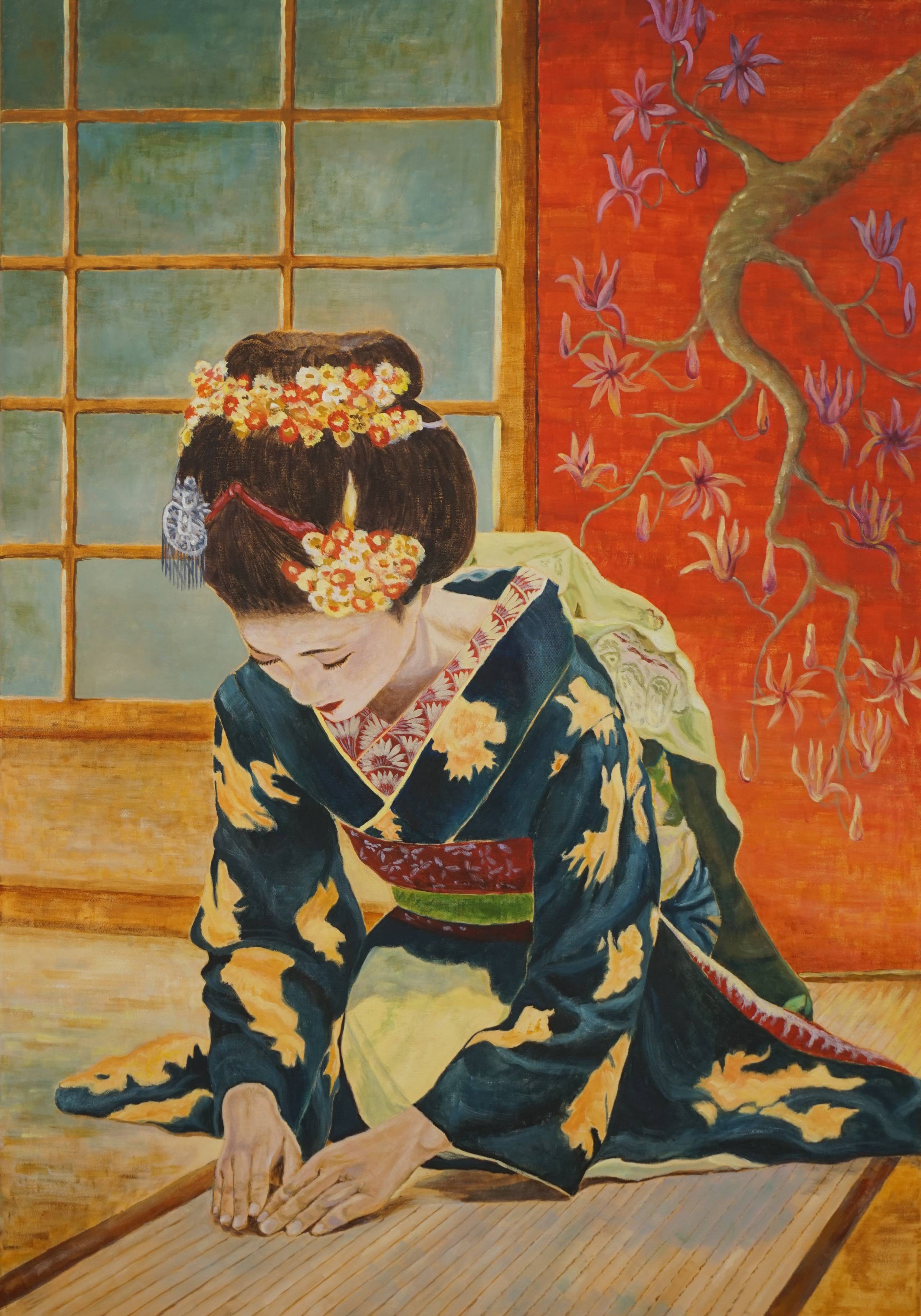 Obraz przedstawia elegancką gejszę, która klęczy przed drewnianą matą. Jej kimono mieni się bogatymi odcieniami granatu i żółci, tworząc wrażenie misternej tkaniny. Włosy, upięte starannie w kok, zdobią kwieciste ozdoby, to prawdziwa artystyczna finezja. Obok niej widać jasną zasłonę z kwitnącą gałęzią, co dodaje temu miejscu nutę fantastical. W odcieniach ciepłych pomarańczy i stonowanej zieleni tkwi ukryty spokój. Atmosfera jest niemalże ceremonialna, przypominając o starożytnej sztuce japońskiego ceremoniału. To moment, który emanuje ciszą i skupieniem. Obrazuje takie 'quiet beauty', które wywołuje nostalgię. Artyście udało się uchwycić chwilę pełną subtelnej elegancji i harmonii. Użyte techniki, delikatne pociągnięcia pędzla, mieszają styl realistyczny z impresjonistycznym, nadając obrazowi niepowtarzalną teksturę. Magiczny świat, jak z bajki, gdzie wszystko wydaje się uporządkowane i estetyczne. Na taki widok można odnaleźć spokój. Taki obraz przypomina mi o tym, jak ważne jest zatrzymanie się na chwilę, zanurzenie w pięknie i wdzięku codzienności. Ma w sobie coś z bajki, jakby gejsza za chwilę miała zagrać na magicznej harfie. Dla dziecka to prawdziwa baśń na jawie!