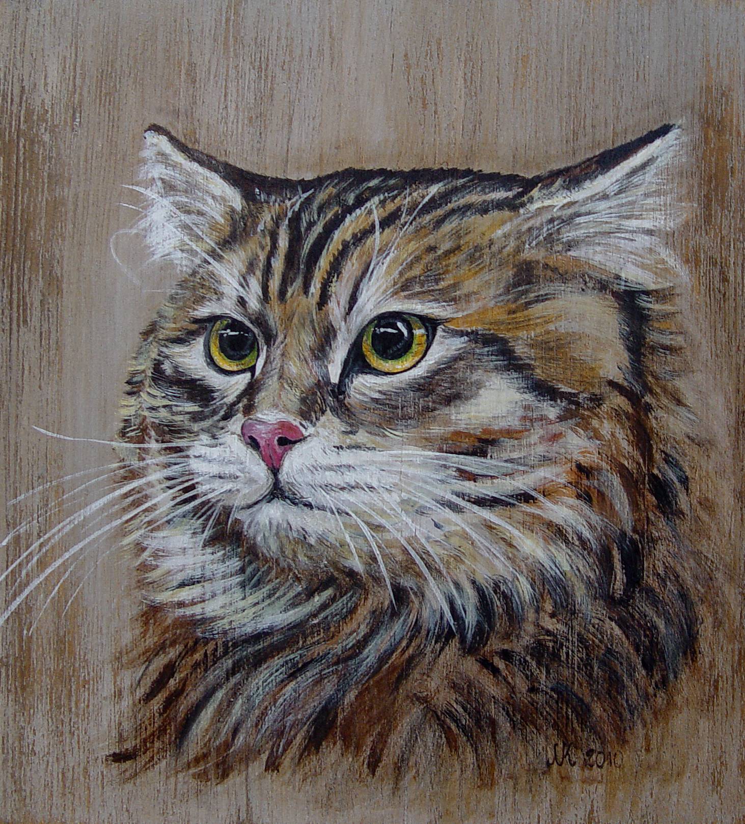Na tym obrazie widzimy niezwykle realistyczne przedstawienie kota. Jego oczy, duże i błyszczące, patrzą gdzieś w dal, budząc zaciekawienie. Kolory są stonowane, dominują brązy i beże, które przeplatają się w futrze zwierzaka, dodając mu naturalności i ciepła. Tło jest jednolite, surowe, przez co postać kota wybija się na pierwszy plan. Obraz emanuje spokojem i pewną zadumą, a może nawet nutą nostalgii. Artysta zastosował technikę pędzla, dzięki której szorstkość futra jest doskonale oddana. Charakterystyczne pociągnięcia farby nadają mu teksturę i głębię. Styl jest realistyczny, lecz nie brakuje w nim artystycznej swobody. Jest coś magicznego w spojrzeniu tego kota. Jakby chciał powiedzieć: "hello, świat jest piękniejszy z tej perspektywy". Czuję, że obraz wywołuje we mnie spokój i wewnętrzne ciepło. Może to przez te oczy, które zdają się patrzeć prosto w duszę. Chce się chwilę zatrzymać i zanurzyć w tej ciszy, jakby świat poza ramą przestał istnieć. Jeden ze znaczków chciałby pewnie powiedzieć: "To kot! Koty są najlepsze!" I nie sposób się z tym nie zgodzić.