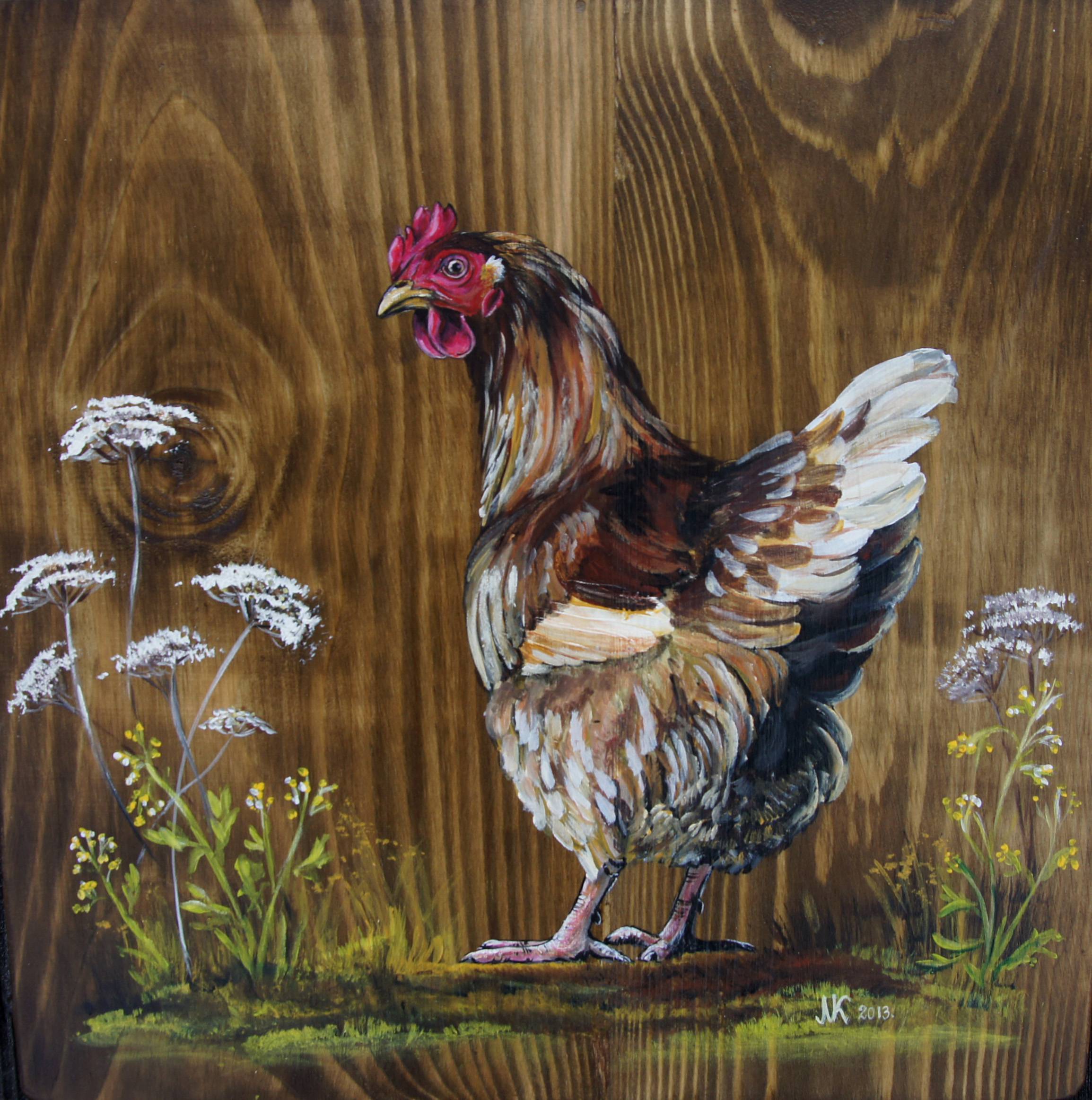 Obraz przedstawia uroczą kurę stojącą na tle ciepłego, drewnianego tła. Dominują brązy i beże, z akcentem czerwieni na grzebieniu ptaka. Detale piór są niezwykle starannie namalowane, tworząc efekt naturalizmu. Kura wygląda, jakby zaraz miała gdakać wesołe hello! Rośliny po lewej stronie malują się w odcieniach zieleni i bieli, dodając lekkości kompozycji. Nastrój obrazu jest spokojny, wiejski, jakby wyjęty z babcinego podwórka w letni poranek. Artysta użył precyzyjnych pociągnięć pędzla, mieszając realizm z nutą sielskości. Emocje? Szczęście i prostota codziennego życia. To coś, co chciałoby się zabrać ze sobą na raz. Patrząc na to dzieło, można poczuć ciepło letniego słońca, ciszę przerwaną tylko przez szum liści. Czy to styl folk? Może trochę country? There's a slight touch of nostalgia tutaj. Można poczuć, jakby ten obraz chował tajemnice wiejskiego życia. Patrz, kura na pewno ma coś ciekawego do powiedzenia! Myślę, że taki obraz wywołuje uśmiech, ciepło, wręcz urok domowego ogniska.