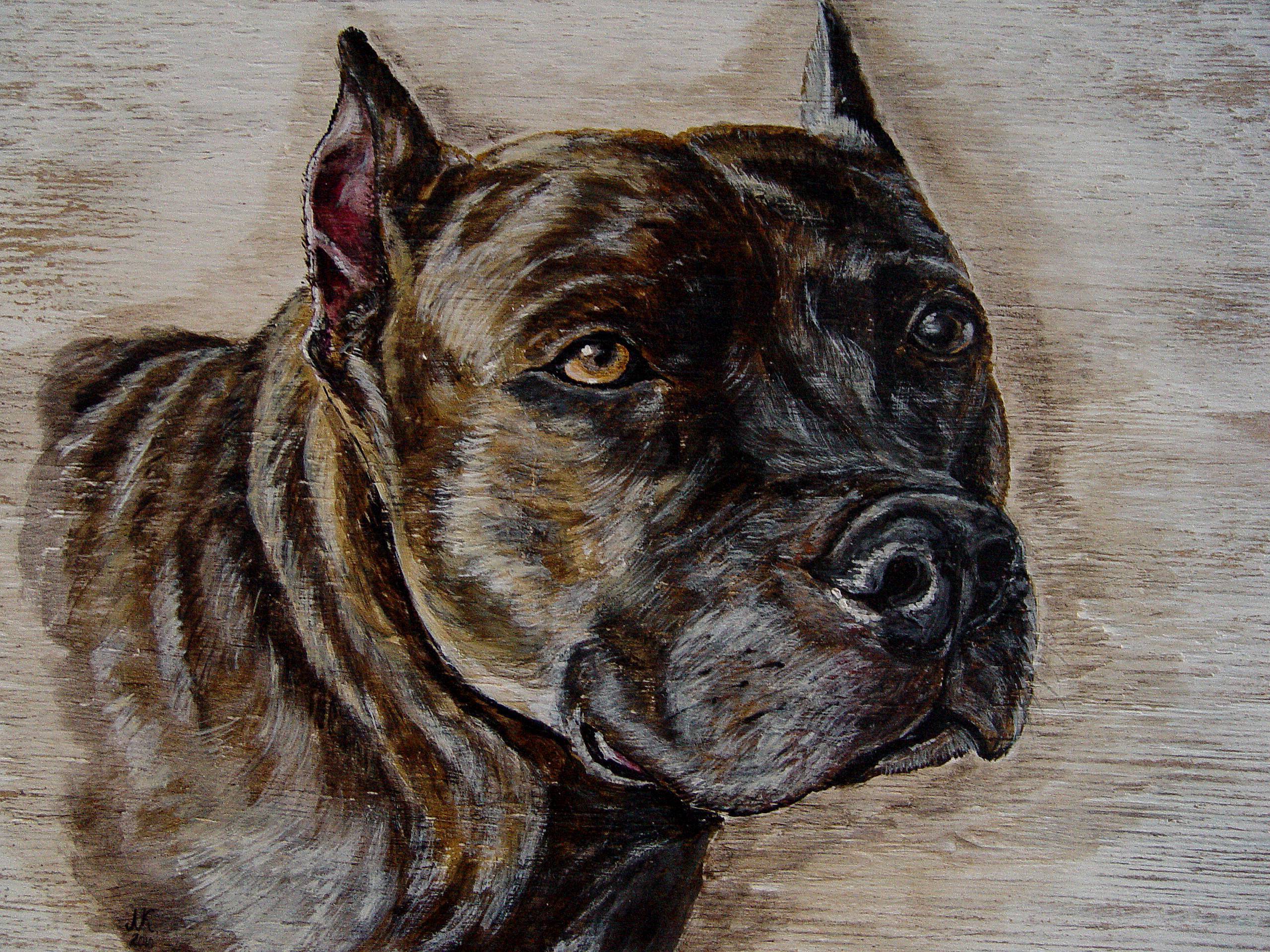 Na tym obrazie widzimy imponujący portret psa namalowany w naturalnych odcieniach brązu i czerni, które płynnie przechodzą pomiędzy sobą, nadając mu realistyczny wygląd. Tło jest minimalistyczne, utrzymane w odcieniach beżu, co dodatkowo podkreśla potęgę i spokój zwierzęcia. Kompozycja skupia się na mocno zarysowanej głowie psa, jego uważnym spojrzeniu, które może wzbudzać różnorodne emocje. Patrząc na to dzieło, można poczuć mieszankę siły i łagodności. Atmosfera obrazu jest pełna dumy i majestatu. Styl artysty to mieszanka realizmu i subtelnego impresjonizmu. Kunsztownie użyte pociągnięcia pędzlem, które nadają fakturze głębokości, zdradzają pewną rękę i oko do detali. Jest tu coś więcej – duch. Pies patrzy na nas z takim "look" pełnym spokoju i pewności siebie. Można niemal usłyszeć niesłyszalny szmer jego oddechu. Obraz przywołuje wspomnienia ciepłych, patrzących na ciebie oczu psa z dzieciństwa. Dziecko powiedziałoby: "To jest piesek, on jest bardzo miły i chce bawić się ze mną." I faktycznie, mimo powagi, jest w tym obrazie coś przyjacielskiego. Ciepło serca. Z takim towarzyszem chciałoby się przebywać. Obraz zaprasza widza do zatrzymania się i przemyślenia swojej relacji z naturą. Cieszy oko i duszę, wprowadzając nieopisany spokój w serce. Punkt dla artysty.