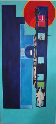 Obraz jest pełen intensywnych kolorów i geometrycznych kształtów, które przyciągają wzrok. Dominuje tutaj głęboki granatowy kolor, kontrastujący z intensywną czerwienią i pomarańczem słońca w tle. Takie zestawienie kolorów tworzy dynamiczną kompozycję, która wydaje się niemal pulsować energią. Atmosfera tego dzieła jest nieco tajemnicza i intrygująca. Wyczuwalny jest chaos, a zarazem harmonia, co nadaje całości niepowtarzalny nastrój. Styl artystyczny to ciekawa mieszanka abstrakcji i modernizmu, z wyraźnym zamiłowaniem do geometrycznej precyzji i koloru. Artyście udało się stworzyć iluzję przestrzeni za pomocą płaskich, ale intensywnie nasyconych form. Technika, którą zastosował, to prawdopodobnie akryl, który idealnie nadaje się do uzyskania tak głębokich i żywych barw. Obraz może wywoływać różnorodne emocje i interpretacje. Dla jednych może być to eksplozja energii i pejzaż futurystycznego miasta. Dla innych refleksja nad wewnętrznym chaosem i poszukiwaniem równowagi. Dziecko mogłoby powiedzieć: "To wygląda jak wielki plac zabaw w kosmosie!" Szukając osobistych odniesień, można poczuć pewną nostalgię za beztroskimi chwilami, choć jest w tym też nuta tajemniczości. It's fascinating, jak obraz przyciąga swoją prostotą i złożonością jednocześnie. Wzbudza we mnie refleksję nad współczesnym światem, który czasem bywa zbyt szybki i intensywny, ale również pełen ukrytych piękności.