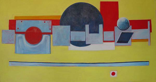 Na obrazie dominują żywe kolory, przyciągają uwagę intensywne żółcie, głębokie czerwienie oraz stonowane błękity. Kształty są geometryczne, uporządkowane jak w kalejdoskopie form i odcieni. Kompozycja wydaje się wyważona, ale przyciąga wzrok swoją nieoczywistością. Klimat tego dzieła to balans między spokojem a energią. Niby prostota, a jednocześnie dynamizm. Artysta zastosował styl abstrakcyjny, wykorzystując techniki mieszania kolorów, by stworzyć efekt głębi i przestrzeni. Dzieło emanuje ciekawością i intrygą. Może wywołać w odbiorcy poczucie harmonii, ale i chęć poszukiwania sensu w chaosie. Oj, patrzę na ten obraz i czuję, jakby miał mi coś ważnego powiedzieć. A może to tylko moje własne pragnienia przemawiają przez te barwy? "Wow, co za świetne kółka!" mogłoby powiedzieć małe dziecko. Wydaje się, że każdy element tutaj mówi swoim własnym językiem. Patrzę na to i myślę sobie, jak czasem nasze życie jest takie mixed up, a tu, na płótnie, to wszystko nagle wydaje się mieć sens. Fascynujące jest, jak sztuka potrafi pobudzić naszą wyobraźnię i sprawić, że zaczynamy widzieć rzeczy w nowym świetle. Ten obraz to nie tylko kolory i formy. To podróż w głąb emocji i interpretacji.