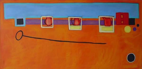 Ten obraz to prawdziwa feeria kolorów. Dominują tu intensywne pomarańcze i kontrastujące błękity, które przyciągają wzrok już z daleka. Kompozycja jest niezwykle dynamiczna, z prostokątnym pasem rozciągającym się w poprzek całego dzieła. Wykorzystane kształty — kwadraty i prostokąty — tworzą rytmiczny układ, dodając całości harmonii. Czuć tutaj atmosferę radości i spontaniczności, niemal jakby artysta chciał powiedzieć: "Ciesz się życiem!". Styl jest zdecydowanie abstrakcyjny, z elementami geometrycznymi. Technika przypomina nieco pracę pędzla w akrylu, z wyrazistymi liniami i żywymi, wręcz krzykliwymi kolorami. Gdy patrzysz na ten obraz możesz poczuć się jakbyś zanurzał się w ciepłym letnim dniu. "It feels alive!" można by rzec, bo emanuje energią i optymizmem. Interesujące zestawienie kolorów może wywołać zarówno uśmiech jak i chwilę zadumy. Dla mnie to obraz pełen pozytywnych wibracji, ja chcę go mieć na ścianie. A chłopczyk powiedziałby: "To mi wygląda jak zabawa!". Czasem wystarczy taki prosty przekaz, by zrozumieć, że sztuka to nie tylko forma, ale i uczucia, które ze sobą niesie.