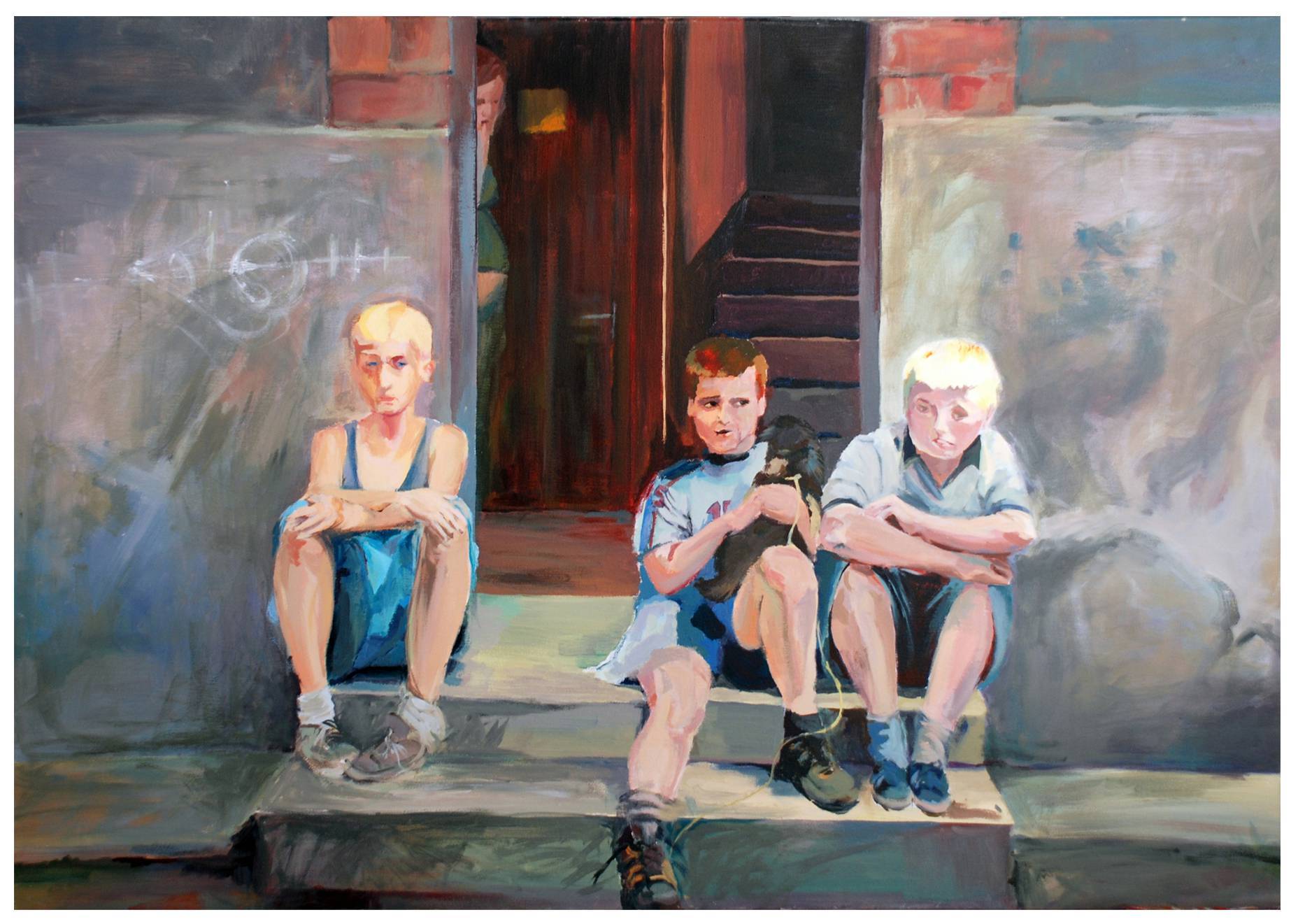 Na obrazie widzimy trzech chłopców, siedzących na schodach przed starym budynkiem. Całość utrzymana jest w stonowanej palecie, z dominacją szarości przeplatanej ciepłymi odcieniami włosów chłopców. Kompozycja jest zrównoważona, przyciąga wzrok do centralnej postaci trzymającej małego zwierzaka, co dodaje ciepła całej scenie. Atmosfera obrazu jest subtelnie melancholijna, jakby lato już się kończyło, a zabawa na podwórku zamieniała się w wspomnienie. Artystyczny styl, z lekkim pociągnięciem pędzla i miękkimi konturami, przypomina impresjonizm, choć z nutą surowości. Chłopcy zdają się być zamyśleni, zatopieni we własnych myślach. „Ja też tak siedzę z moim pieskiem” – mogłoby powiedzieć dziecko, które patrzy na ten obraz. Czy to nostalgia, czy tajemnica codziennego dzieciństwa? To się tylko można domyślać. Delikatne niedoskonałości w obrazie oddają prawdziwość momentu. To „slice of life”, które motywuje do refleksji nad beztroską. Obraz wzbudza ciepło i lekki smutek, jednocześnie zatrzymując chwilę, jakby mówił: „Zatrzymaj się i popatrz jeszcze raz”.