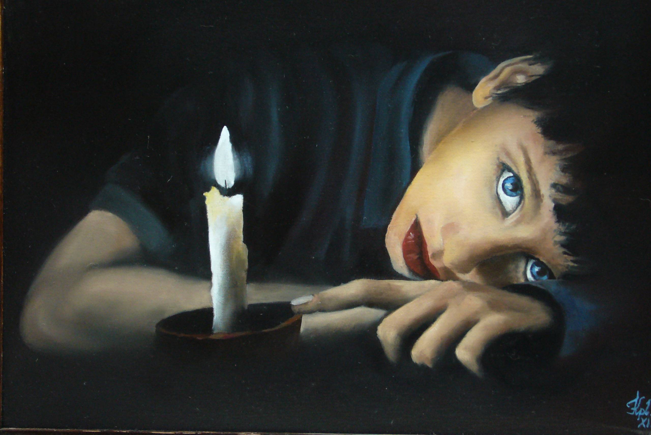 Na obrazie widzimy osobę z głową wspartą o dłonie, patrzącą na płomień świecy. Dominują ciemne kolory, które nadają dziełu tajemniczy, niemal melancholiczny nastrój. Twarz oświetlona jest ciepłym blaskiem, co kontrastuje z ciemnym tłem. Świeca emituje delikatne światło, które nadaje miękkości i intymności. Styl obrazu przypomina realistyczną technikę z mocnym naciskiem na chiaroscuro, co podkreśla emocjonalną głębię. Można by powiedzieć, że patrząc na ten obraz, czujemy spokój i zamyślenie. Dzieło to marszczy brwi u każdego, kto na nie spojrzy. Expression of solitude – oto co przychodzi na myśl. Dzieci też by to poczuły. Ja bym się nad tym zamyślił. Oczy postaci mówią o smutku, ale i pewnej nadziei. Interpretacja może być wieloraka: może to refleksja nad przemijaniem czasu, może tęsknota za czymś straconym. Malatura ma miękkość, jakby farby były starannie blendowane. Całość sprawia, że mimowolnie zaczynamy zastanawiać się nad własnym życiem. Obraz emanuje ciszą, tą, co skłania do myślenia.