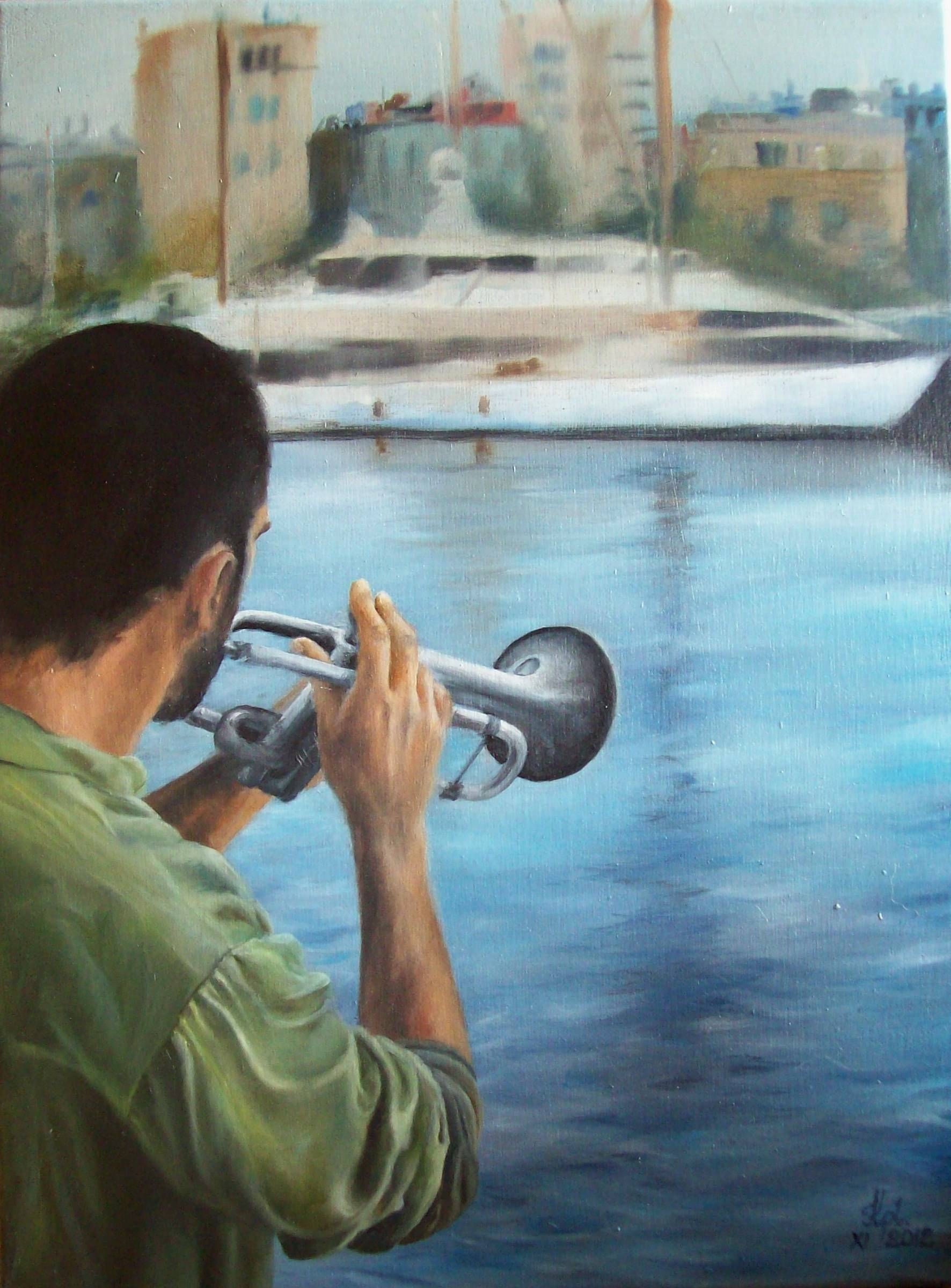 Na obrazie widzimy mężczyznę grającego na trąbce nad spokojnym błękitnym taflią wody. Jego postać podkreślona jest przez ciepłe, ziemiste kolory, które kontrastują z chłodnymi odcieniami tła. W tle majaczą sylwetki budynków i łodzi, tworząc niemal impresjonistyczny efekt. Atmosfera tego dzieła emanuje spokojem i melancholią, jakby dźwięki trąbki miały ukoić duszę. Artysta używa miękkich pociągnięć pędzla i delikatnych przejść tonalnych, co nadaje obrazowi wyrazistości, ale jednocześnie subtelności. Obraz może wywoływać w odbiorcy uczucie nostalgii i tęsknoty za chwilami spokoju. Czuję się, jakby dźwięk trąbki unosił się w powietrzu, dodając magic touch całej scenie. To tak jakby świat na chwilę zamarł, skupił się tylko na tej jednej chwili. Myślę, że 7-latek powiedziałby: "Pan gra bardzo głośno, ale chyba dobrze mu idzie!". To dzieło przypomina mi o sile muzyki i jej zdolności do przenoszenia nas w inny wymiar, z dala od codziennych trosk.