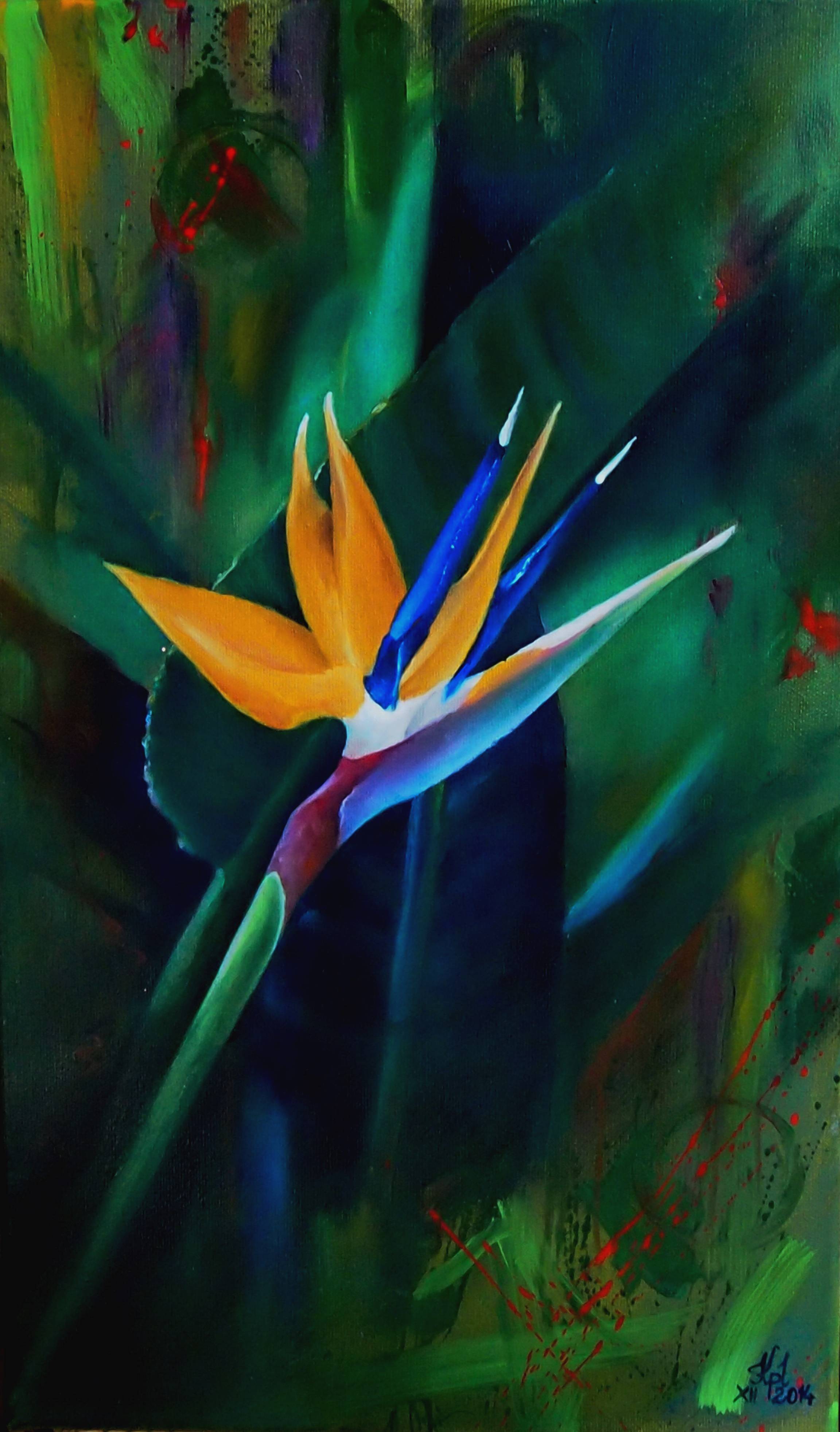Na obrazie widzimy zachwycający kwiat Strelicji, który zdaje się wyłaniać z gęstej, zielonej odmętu liści, tworząc kontrast pełen napięcia. Żywe odcienie pomarańczu i błękitu przyciągają wzrok, tworząc kompozycję, która pulsuje energią. W tle dominują zielenie, przełamane drobnymi, czerwonymi akcentami, które nadają całości dynamicznego charakteru. Obraz emanuje spokojem, ale jednocześnie ma w sobie coś nieuchwytnego, almost like a secret waiting to be discovered. Technika malarska sprawia wrażenie płynności, z subtelnymi przejściami kolorów i delikatnymi pociągnięciami pędzla. Artysta zastosował ciekawe sposoby gry światła i cieni, co dodaje głębi i trójwymiarowości. Patrząc na obraz, można poczuć delikatne poruszenie wiatru i zapach egzotycznych kwiatów, które wywołują uczucie nostalgii za tropikalnymi miejscami. Kolorki są śliczne, a kwiat wygląda jakby był z bajki! Ten obraz jest tak żywy, że prawie można usłyszeć dźwięki dżungli w tle.