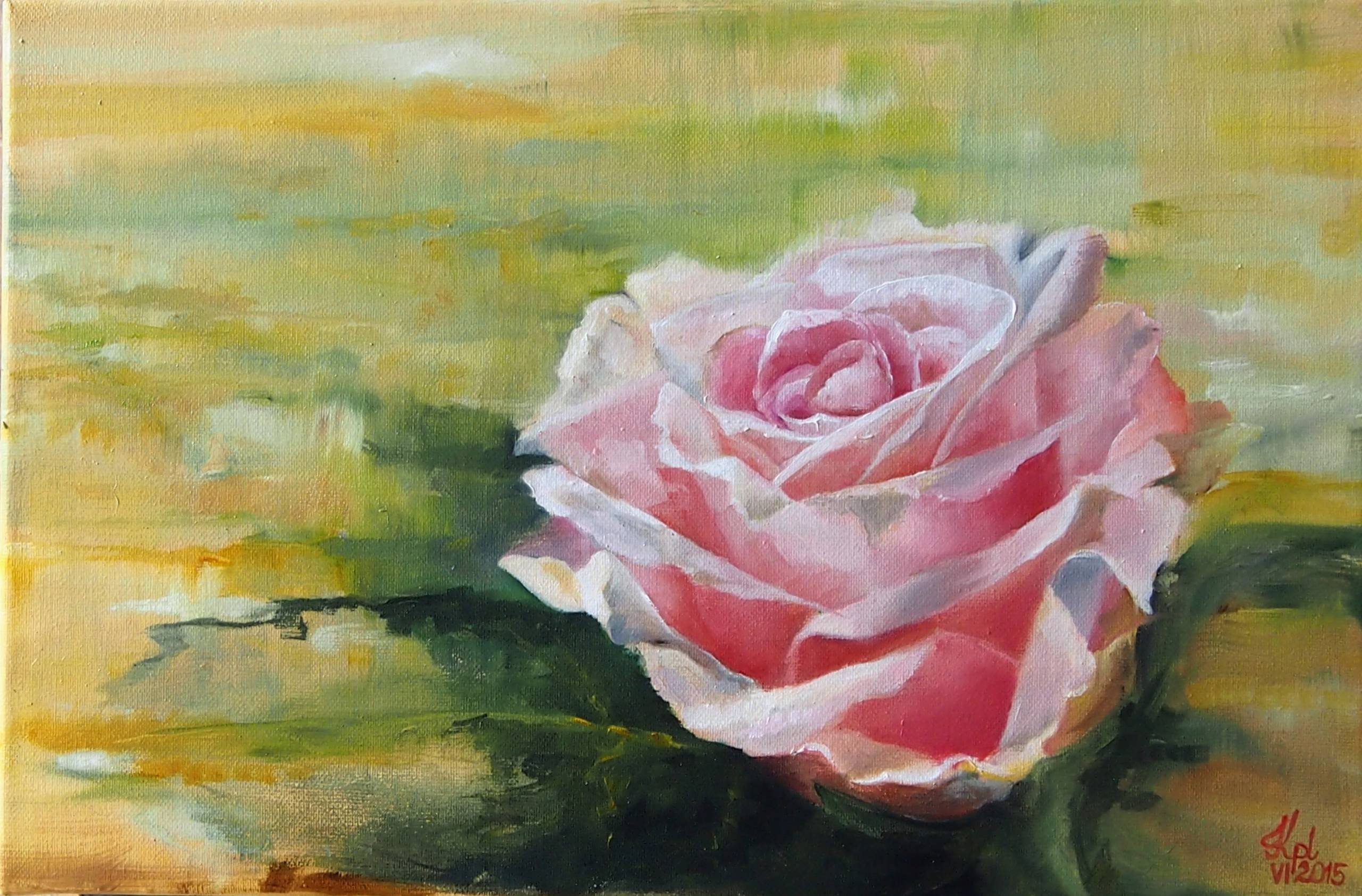 Na tym obrazie dominuje piękna, subtelna różowa róża, wyłaniająca się delikatnie z zielono-żółtawego tła. Jej płatki są wyraziste, niemal trójwymiarowe, oddając wrażenie miękkości i delikatności. Artysta operuje tutaj techniką olejną, co widać po bogatych przejściach kolorystycznych i delikatnych światłocieniach. Ta róża wygląda jak marzenie na jawie. Atmosfera obrazu jest idylliczna i sielska, przywodząc na myśl letnie dni pełne spokoju. Kolory są stonowane, ale jednocześnie żywe, podkreślając naturalne piękno kwiatów. Kompozycja kieruje nasze spojrzenie na centralnie umieszczony kwiat, sugerując jego wyjątkowość i symboliczne znaczenie. Można tu poczuć pewien romantyzm, powiew nostalgii, a nawet tęsknotę za czymś ulotnym. Myślę sobie: "Wow, jaki piękny kwiatek," powiedziałoby dziecko. Patrząc na ten obraz, można się zastanowić, jak wiele piękna kryje się w prostocie natury. To przypomnienie o kruchości i jednoczesnej sile żywych organizmów. Kiedy się na niego patrzę, czuję spokój, ale i nutkę melancholii. To trochę jak oglądanie "beauty of life" w jednym, prostym przedstawieniu. Ten obraz skłania mnie do zatrzymania się i podziwiania codziennych cudów.