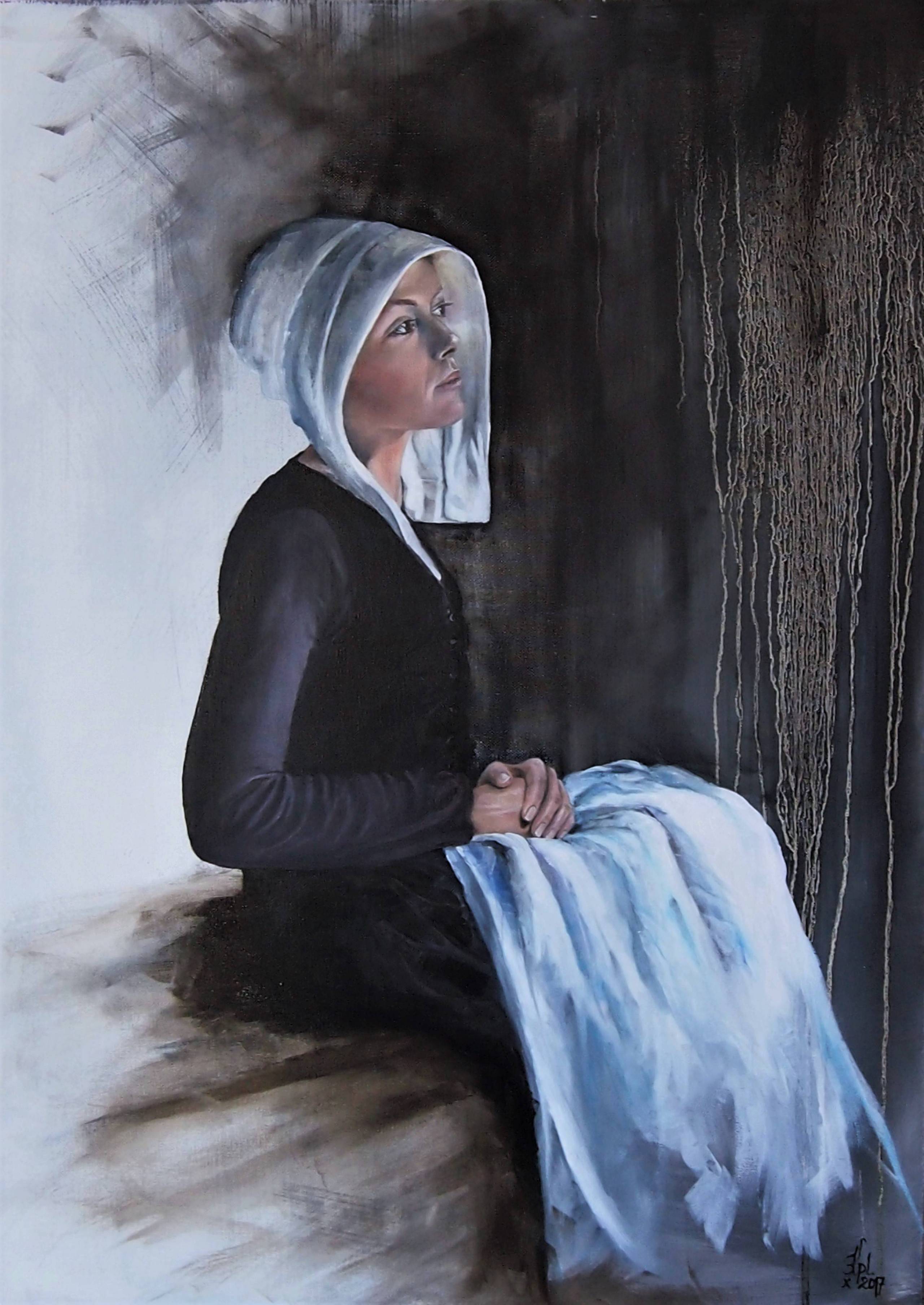Na obrazie widzimy spokojną scenę z kobietą w centrum uwagi. Kolorystyka jest stonowana, dominują ciepłe brązy i chłodne odcienie niebieskiego, co nadaje całości melancholijny charakter. Ciemne tło kontrastuje z jasnością białego czepka i szaty kobiety, nadając jej postaci tajemniczego blasku. Kompozycja obrazu jest prosta, ale zarazem niezwykle wyważona, co prowadzi oko widza prosto do twarzy kobiety, pełnej zadumy i skupienia. Atmosfera obrazu jest nostalgiczna, trochę jakby zza mgły. Wydaje się, jakby czas się zatrzymał, a bohaterka zanurzyła się we własnych myślach. Styl artystyczny przypomina malarstwo realistyczne z odrobiną impresjonistycznej techniki w przedstawieniu tkanin i detali. Płynne pociągnięcia pędzla tworzą delikatny efekt ruchu, który nadaje obrazowi dynamiki pomimo statycznej pozy bohaterki. Patrząc na ten obraz, można poczuć spokoj i ciszę. Zastanawiające, jakie historie kryją się za tym zamyślonym wyrazem twarzy. Dla dziecka mogłoby to być "pani w czapeczce myśli o chmurkach". Artysta użył techniki chiaroscuro, aby wydobyć trójwymiarowość postaci, dodając jej głębi i wymiaru. Dla odbiorcy, ten obraz może być zarówno pocieszeniem, jak i zachętą do refleksji nad własnym życiem. A teraz myślę sobie, how beautiful it is, że poprzez sztukę możemy sięgać tak głęboko w ludzkie emocje.