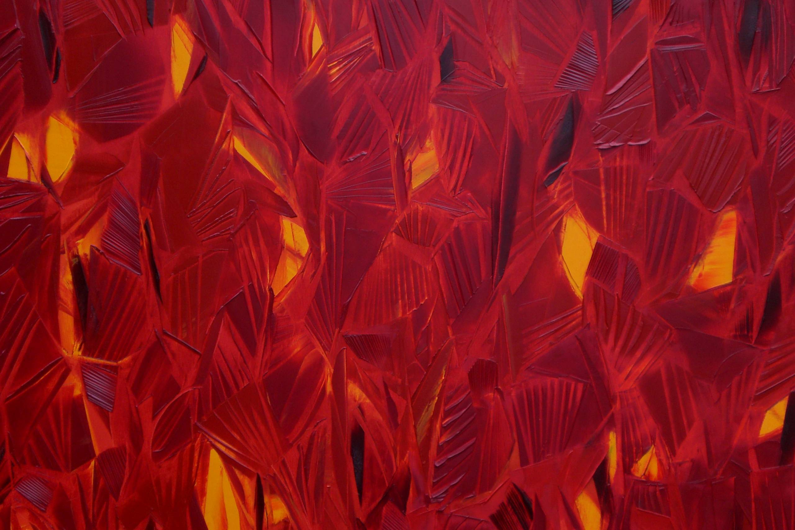 Obraz mieni się intensywnymi odcieniami czerwieni i pomarańczu, które przypominają płomienie tańczące w kominku. Kształty są ostre i nieregularne, jakby wycięte ze szklanej tafli, co nadaje dziełu dynamicznej energii. Kompozycja jest gęsta, gmatwanina form wydaje się wręcz kipieć na powierzchni. Myślę sobie, że to jakby obraz próbował opowiedzieć swoje ogniste historie. Atmosfera, jaka się z tego obrazu wylewa, jest pełna pasji i dramatu. Czujesz się, jakbyś stał przed potężnym żywiołem, który w każdej chwili mógłby cię pochłonąć. Artystyczny styl jest zdecydowanie abstrakcyjny, a techniką zdaje się być "impasto", gdzie farba została nałożona grubymi pociągnięciami, tworząc wypukłości. Emocje, jakie wywołuje ten obraz, mogą być mieszane – dla jednych może to być siła i determinacja, dla innych chaos i niepokój. Stylem mógłby wpisać się w nurt ekspresjonizmu. Pomyślałem sobie: "This painting is so fiery!" Nawet dziecko powiedziałoby: to wygląda, jak wielki ogień! Osobiście wydaje mi się, że artysta chciał nas porwać w wir własnych emocji, takiej spontanicznej burzy uczuć.