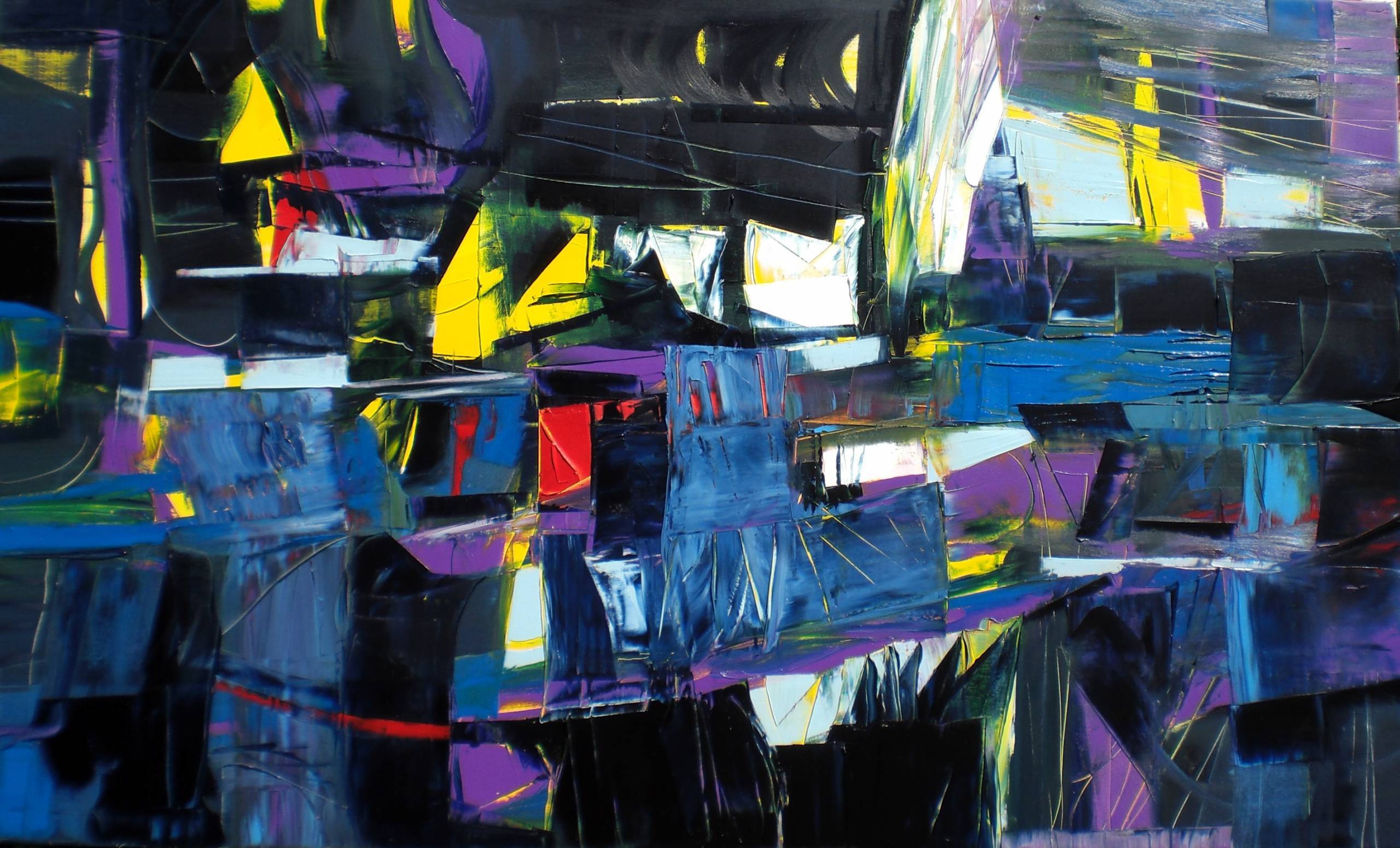 Przed tobą obraz pełen energii i ruchu. Dominują na nim intensywne barwy: głęboki granat, jaskrawa żółć, elektryzująca fiolet i zaskakująca czerwień. Wszystkie te kolory są jakby w radosnym tańcu, przeplatając się ze sobą, tworzą dynamiczną kompozycję pełną kontrastów. Prostokątne i kanciaste kształty zdają się walczyć o uwagę widza, a nieregularne linie dodają całemu dziełu niepokojącego charakteru. Atmosfera obrazu jest jakby rozedrgana, pełna napięcia emocjonalnego, od którego trudno się oderwać. Czujesz się jakbyś był w środku chaosu, ale w tym chaosie jest coś hipnotyzującego. Artysta użył techniki mieszanej, gdzie pociągnięcia pędzla łączą się z gładkimi plamami kolorów, tworząc iluzję głębi. To impresjonizm z nutą abstrakcji, gdzie forma schodzi na dalszy plan, ustępując miejsca emocjom. Gdy patrzę na to dzieło, czuję, jakby to była opowieść o naszym chaotycznym świecie, pełnym niespodzianek i kontrastów. Wow! Dziecko powiedziałoby pewnie: "To wygląda jak bałagan z farbami!". Niesamowite, jak jeden obraz może wywołać tyle różnych reakcji. A ty, co czujesz patrząc na te pełne energii kolory? Dla mnie to istny "color explosion", zastrzyk radości i fascynacji, który na długo pozostaje w pamięci.