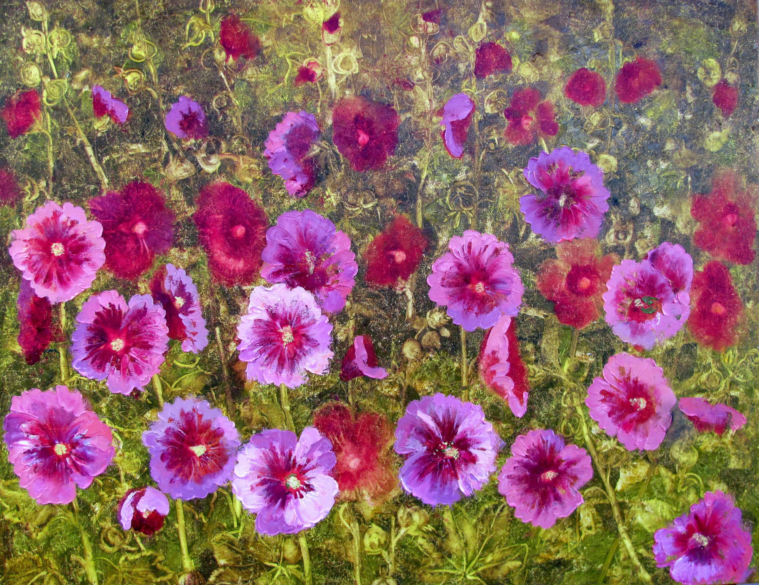 Na obrazie widzimy pełen blasku ogród, w którym dominują żywe, purpurowe i różowe kwiaty. Kolory, soczyste i nasycone, rozchodzą się na boki jak promienie słońca. Zielenie tła subtelnie przechodzą w różnorodne odcienie czerwieni i fioletu, tworząc efektowną mozaikę. Kształty kwiatów są nieco rozmyte, co dodaje całości lekkości i jakby marzycielskiego charakteru. Atmosfera jest pełna spokoju i nostalgii. Można odnieść wrażenie, że to zatrzymana chwila w pełni lata. Styl obrazu przypomina impresjonizm, z jego wyraźnymi pociągnięciami pędzla i lekko rozmytymi kształtami. Artystyczna technika zastosowana tutaj, z grubo nakładanymi warstwami farby, dodaje głębi. Obraz może wywoływać w odbiorcy uczucie błogości, przenosząc go w świat pełen pachnących kwiatów. Czuję, jakby powietrze było świeże, a słońce muskało policzki. Wow, ale te kwiaty są kolorowe! Dla niektórych to może być "escape" od codzienności, zanurzenie w chwili pełnej barw i życia. Patrząc na ten obraz, przypominają mi się letnie popołudnia spędzane na wsi, gdzie czas płynął inaczej. Może i ty znajdziesz tutaj cząstkę siebie, zanurzoną w chwilowym zapomnieniu.