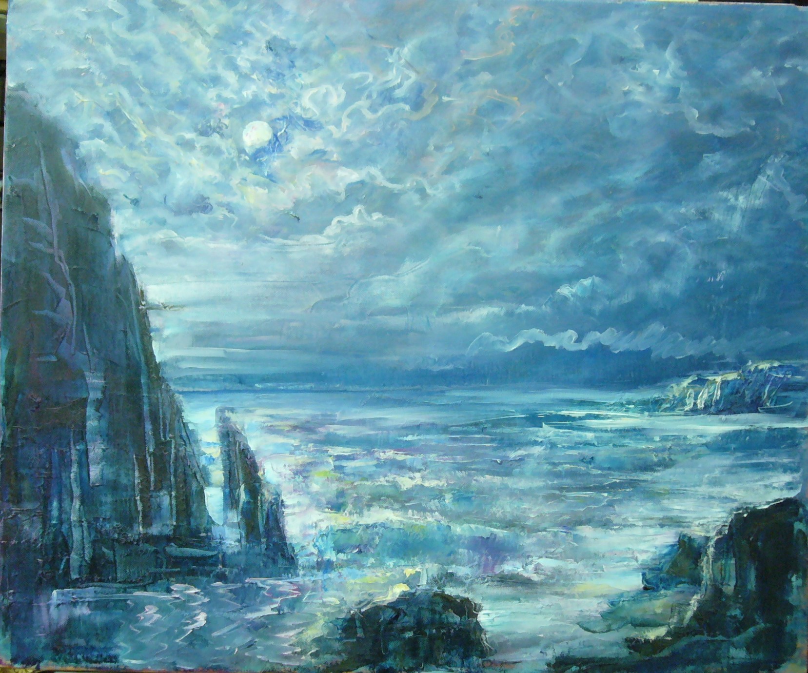 Na obrazie dominuje chłodna paleta kolorów: odcienie niebieskiego, szarości i bieli, które tworzą tajemniczą aurę. Klify po lewej stronie są monumentalne i mroczne, ich zarys ostro odcina się od delikatnego blasku księżyca. Kolory przeplatają się, tworząc efekt space umysłowej podróży, jakbyśmy patrzyli na inną planetę. Niebo jest pełne ruchu, z chmurami wirującymi jak mgła. To dzieło ma w sobie coś niesamowicie kojącego, ale też niepokojącego. Atmosfera obrazu to mieszanka spokoju i tajemnicy. Przyciąga wzrok, a jednocześnie wprowadza w stan zadumy. Technika artysty jest malarska, z wyraźnym pociągnięciem pędzla, co nadaje całości dynamiczność. Praca ta zdaje się być czymś więcej niż tylko obrazem – to zaproszenie do wewnętrznej refleksji.
