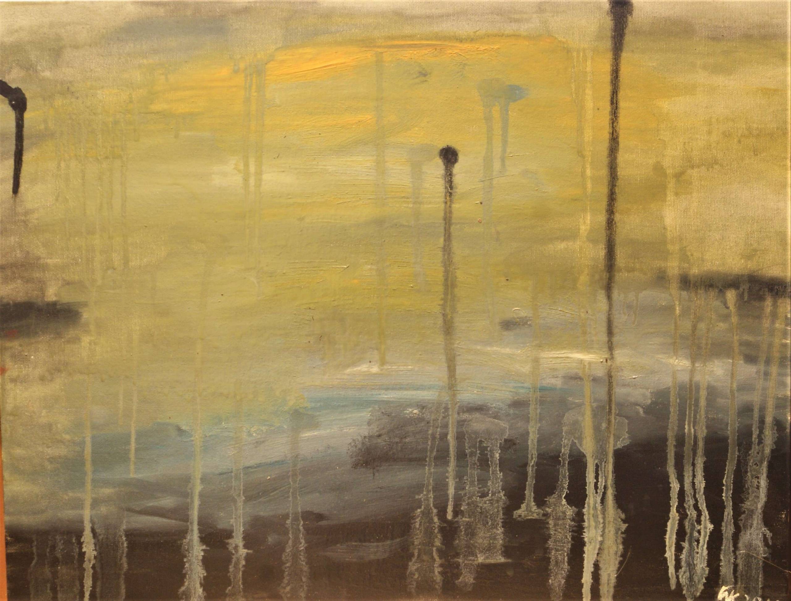 Obraz emanuje tajemniczością, którą tworzą rozmyte, spływające barwy w odcieniach szarości, żółci i błękitów. Czuć tu nieuchwytny rytm natury, jakby deszcz właśnie zmywał zmierzch nad miastem. Technika przeciekających smug dodaje całości nowoczesnego, abstract look. Trochę jak obrazek z mokrej szyby samochodu w letnią ulewę. Kolory delikatnie przechodzą między sobą, tworząc płynne przejścia. To przypomina mi, jak czasem ścigałem się kroplami deszczu na szybie. Atmosfera urzeka nostalgicznym spokojem, jest jak cisza przed burzą. Artysta używa technik impasto, a może drip, które wzmacniają uczucie ruchu i przemijania. Może to smutek, może ulga, zależy jak spojrzeć. Patrząc na to dzieło, można poczuć jakąś wewnętrzną refleksję, może nawet powrót do wspomnień. Czuję się porwany w świat poza czasem, gdzie wszystko jest "fluid". Niesamowite, że prostota może tak uchwycić głębię emocji!