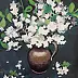 "Kwiaty jabłoni" to impresjonistyczny obraz akrylowy, martwa natura na klasycznym formacie A4. Jest namalowany na płócienku bez blejtramu (drewnianej konstrukcji), a więc zupełnie płaski. Na obrazie znajduje się sygnatura autorki, z tyłu pełne nazwisko, tytuł oraz rok wykonania.