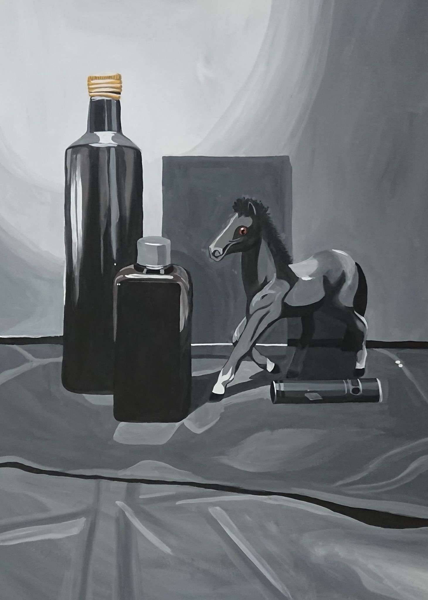 Na obrazie widać minimalistyczną martwą naturę, utrzymaną w odcieniach szarości. Kompozycja obejmuje przedmioty o prostych, geometrycznych kształtach: dwie butelki, ciemny prostokąt oraz figurkę konika. Dominują głębokie, ciemne tony, które kontrastują z subtelną grą światła. Atmosfera jest spokojna, wręcz nostalgiczna, przypomina moment zatrzymany w czasie. Można odnieść wrażenie, że to reflection on simplicity and stillness. Styl jest oszczędny, z wyraźnym naciskiem na grę cieni i światła, co nadaje obrazowi nieco tajemniczości. Technika, być może akrylowa, pozwala na subtelne przejścia tonalne. Obraz wywołuje uczucie nostalgii i refleksji, zachęcając do zatrzymania się i zadumy. "O, ten konik jest śmieszny!" - mogłoby powiedzieć 7-latko, zauważając zabawną figurkę. Patrząc na ten obraz, można poczuć, że artysta chciał przekazać spokój i harmonię. Może nawet uchwycić moment codzienności, który często umyka w biegu. To dzieło skłania do poszukiwania prostoty i piękna w zwykłych przedmiotach, które przecież też mają swoją historię. Czasem mniej znaczy więcej, i właśnie to jest siła tego obrazu.