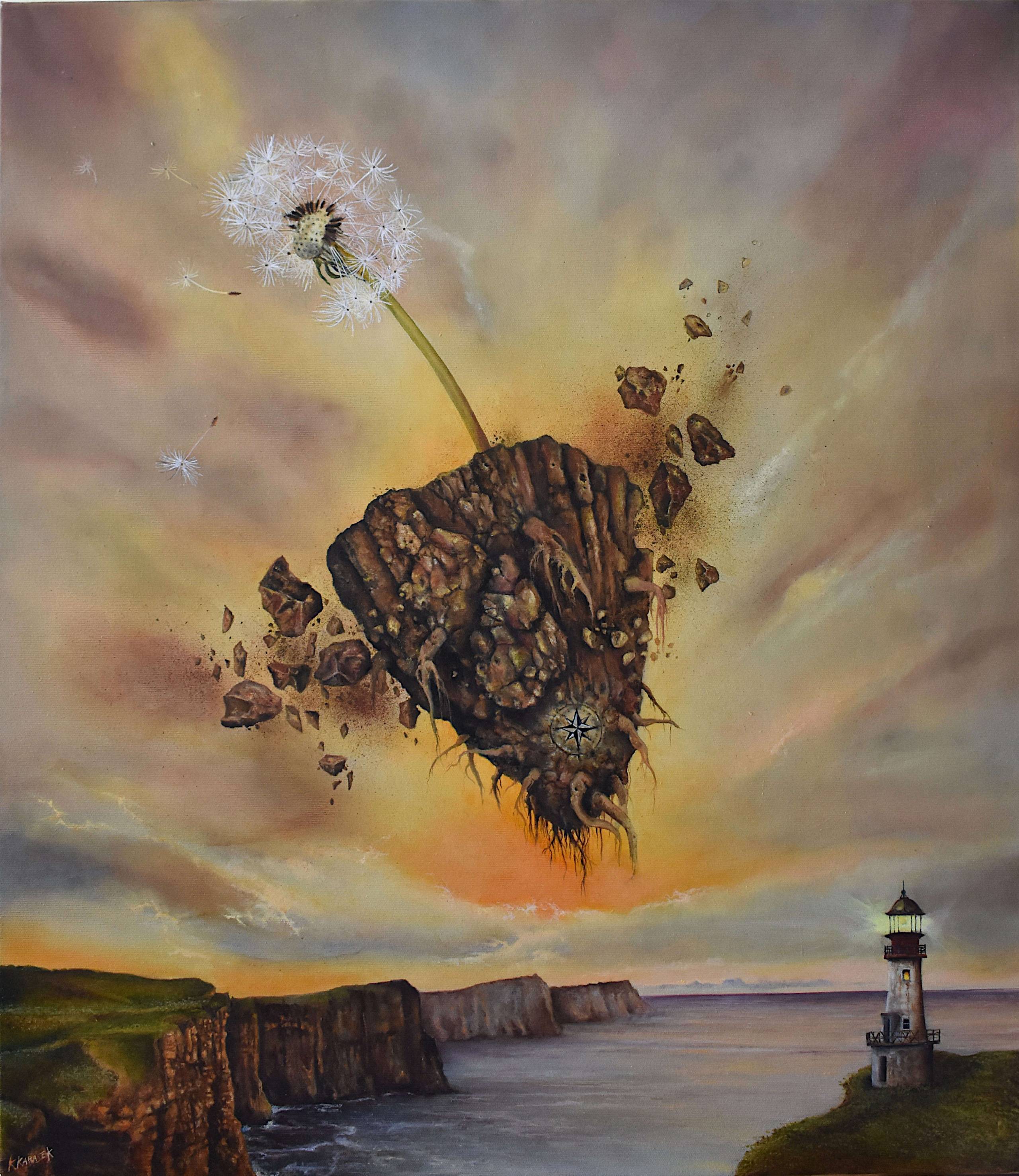Na obrazie widzimy unoszący się kawałek ziemi, z którego wyrasta dmuchawiec. Ten surrealistyczny widok tworzy niesamowitą kompozycję, która przyciąga wzrok. Kolory obrazu są stonowane, dominują ciepłe tony zachodzącego słońca, przechodzące od pomarańczu do złota na tle bladoniebieskiego nieba. Skały, z których wyrasta roślina, wyglądają, jakby się rozpadały, lecąc w powietrzu w stronę latarni morskiej stojącej na skraju klifu. Latarnia zdaje się być strażnikiem tego fantastycznego krajobrazu. Atmosfera jest pełna magii i tajemnicy. Styl artysty łączy realizm z elementami fantastyki. Technika malarska jest precyzyjna, co dodaje obrazowi głębi. To jest takie piękne, jak w bajce! Obraz budzi w widzach poczucie oderwania od rzeczywistości i prowokuje do refleksji nad delikatnością natury. Może nawet odrobinę melancholii. Floating world – tak można opisać obraz w jednym słowie. Obraz wprowadza w stan zadumy, a jednocześnie popycha do odkrywania własnych, ukrytych emocji. Gdy na niego patrzę, czuję się jak w magicznej krainie, gdzie wszystko jest możliwe. Czas się zatrzymuje, a my jesteśmy zaproszeni do odkrywania nieznanego.