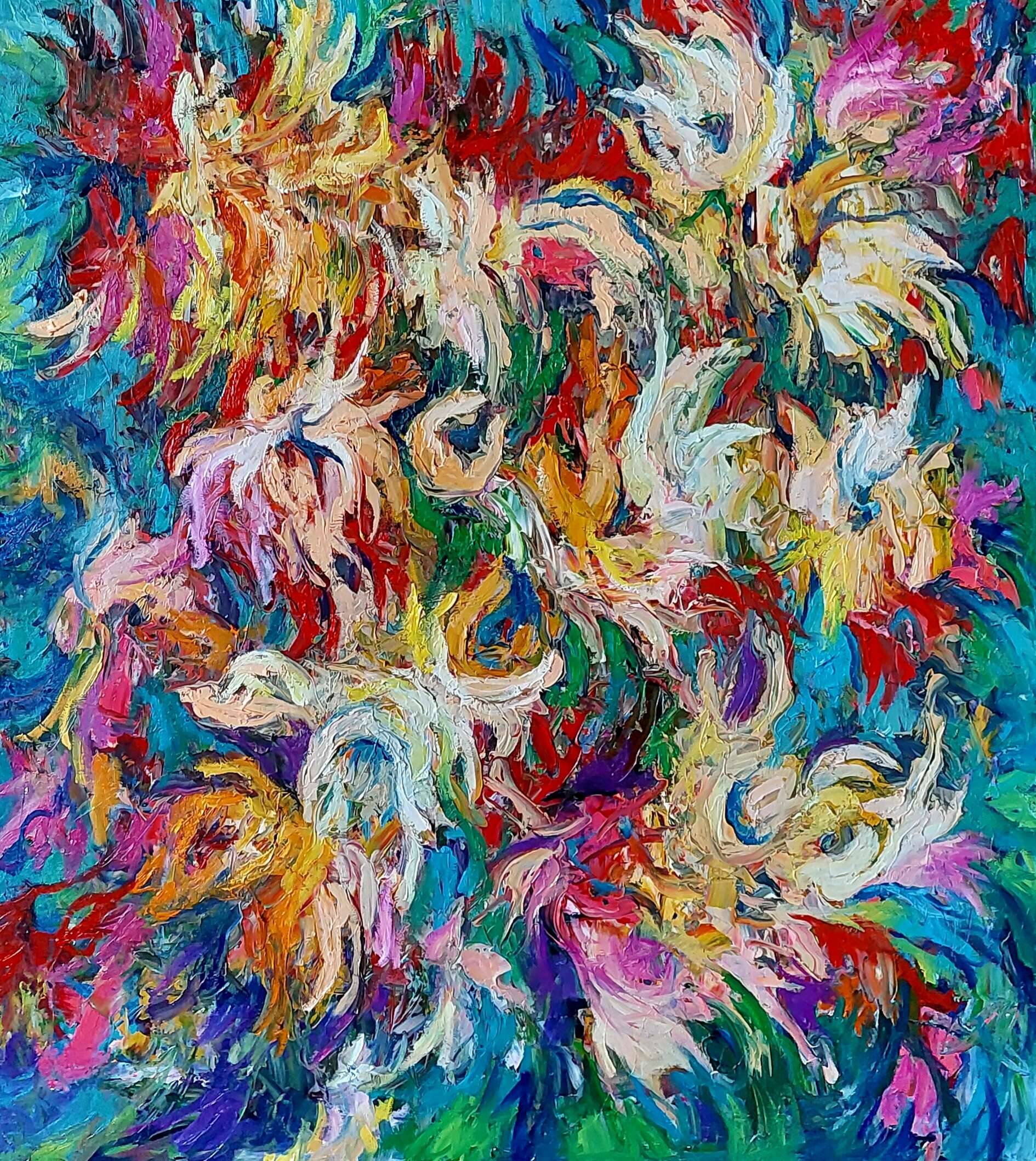 Obraz przed tobą to istna eksplozja barw, które wirują i splatają się na płótnie jak w kalejdoskopie emocji. Dominują tu odcienie czerwieni, błękitu, zieleni i żółci, przypominając feerię kolorów w magicznym ogrodzie. Kompozycja jest dynamiczna, prawie jak taniec płynnych form, które zdają się unosić w powietrzu. Malarska technika artysty to punch of expression, z widocznymi, grubymi pociągnięciami pędzla, które nadają obrazowi trójwymiarowej struktury i wibracji. Atmosfera obrazu tętni życiem i energią. Czujesz, jakbyś wszedł w świat pełen tajemniczych kwiatów czy może nawet fantastycznych stworzeń? Emoce, jakie to dzieło wywołuje, mogą być zróżnicowane. Dla jednych to odzwierciedlenie radości i wolności, dla innych chaos i nieokiełznana siła natury. Imagine, że każdy kolor opowiada osobną historię, tworząc złożoną narrację, która porywa i nie pozwala się oderwać. Styl jest zdecydowanie impresjonistyczny, choć z nutą ekspresjonizmu. Artysta bawi się teksturą i kolorem, pozostawiając wiele miejsca na interpretacje. Dla dzieciaka, ta praca mogłaby wyglądać jak tęcza, która spadła na ziemię i rozbiła się na tysiąc kawałków, prawda? Co ciekawe, mimo pozornego chaosu, obraz wytwarza poczucie harmonii. Fascynujące, jak takie przeciwstawne elementy mogą tak pięknie współistnieć.