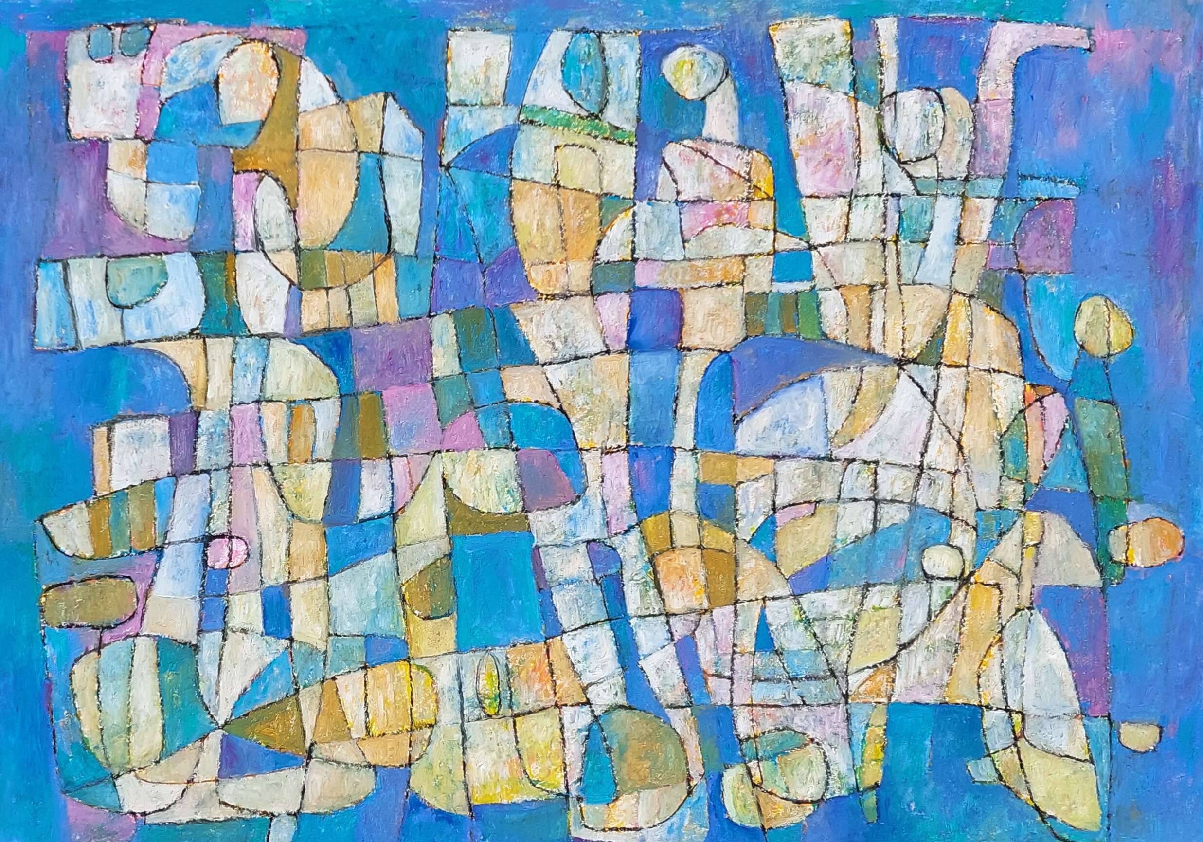 Obraz pełen jest żywych kolorów: błękitów, fioletów, odcieni zieleni i ciepłych kremów, które harmonijnie przeplatają się na płótnie. Prostokątne i zaokrąglone kształty tworzą skomplikowaną kompozycję, która przypomina kalejdoskopowy sen. Można w nim dostrzec jakieś figury, ale trudno dokładnie powiedzieć, co to jest. Atmosfera tego dzieła jest tajemnicza i trochę oniryczna. Taki trochę dreamlike. Artysta zastosował technikę impasto, co daje teksturalną głębię, którą naprawdę czuć, patrząc na powierzchnię obrazu. To jest jak gra w chowanego z zarysem rzeczywistości. Patrząc na to dzieło, można poczuć się jak odkrywca, odnajdujący skarby w każdym rogu. Niektórym może to przypominać puzzle, które trzeba ułożyć w głowie, żeby znaleźć w tym chaosie jakiś sens. Inni zaś mogą poczuć spokój, delektując się samymi kolorami. Myślałem, że to trochę jak zabawa klockami Lego, które układają się w niespodziewane wzory. Moje serce czuje ciepło patrząc na te kolory, które przywołują wspomnienia z dzieciństwa pełnego marzeń i nieskrępowanej wyobraźni.