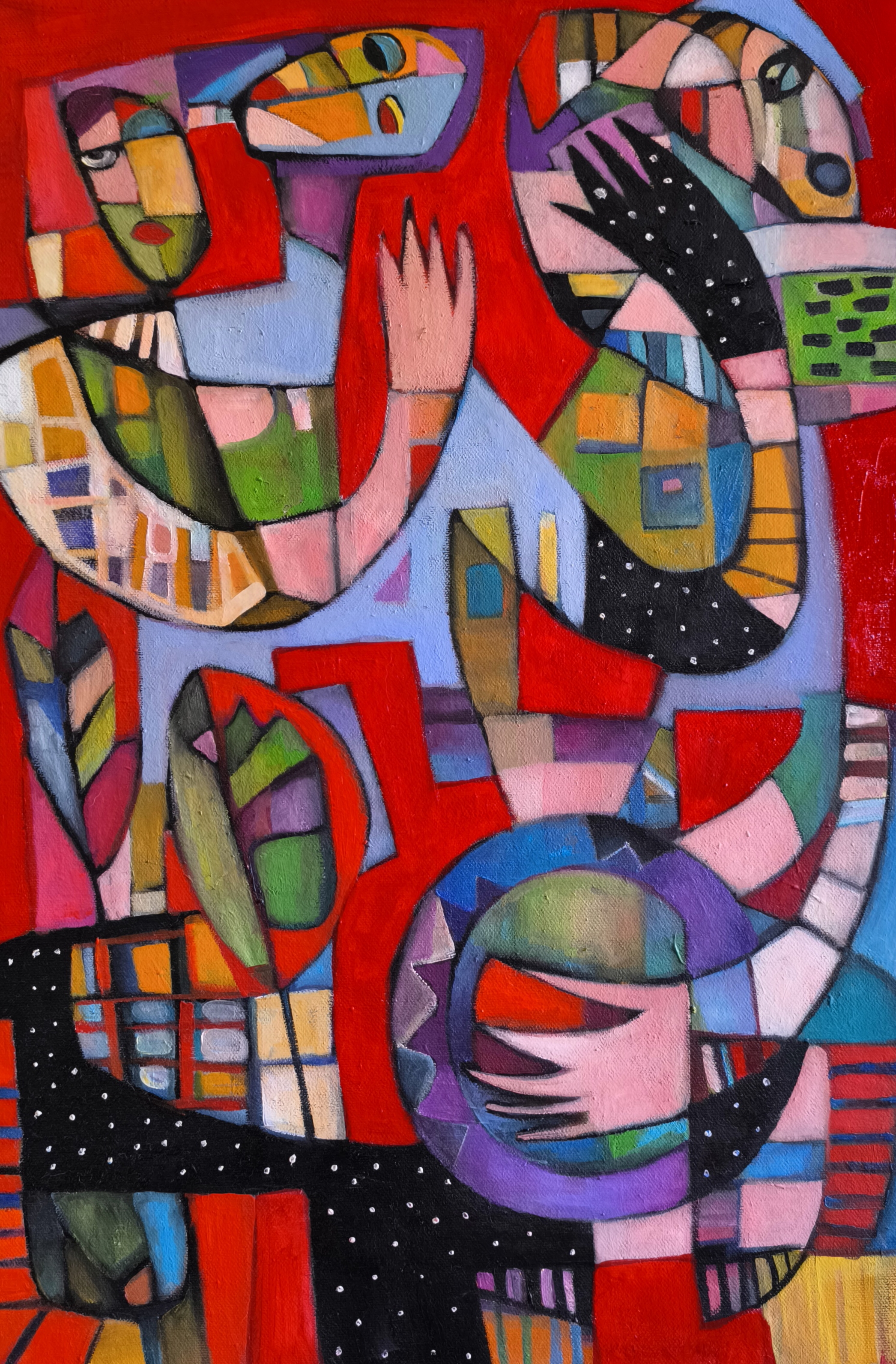 Na obrazie dominuje kalejdoskop barw i form, które natychmiast przyciągają wzrok. Mieszanka żywych kolorów, takich jak purpura, zieleń, błękit i pomarańcz, tworzy dynamiczną kompozycję pełną abstrakcyjnych figur i kształtów. Postacie na obrazie przypominają abstrakcyjne sylwetki z geometrycznymi liniami, które układają się w rytmiczny taniec. Atmosfera jest lekka, a jednocześnie skłaniająca do refleksji, co sprawia, że widz może poczuć się jak w środku kolorowego snu. Styl artysty to mix kubizmu i ekspresjonizmu, a techniki malarskie użyte na płótnie to odważne pociągnięcia pędzlem i intensywne kontrasty barw. Zarysy postaci są zarówno wyraziste, jak i rozmyte, co buduje intrygujący efekt. Obraz może wywołać u odbiorcy poczucie chaosu, ale i pewnego rodzaju harmonii ukrytej w tym chaosie. Czuję, jakbym patrzył na "dream" pełen ukrytych historii. Patrząc na ten obraz, przypomina mi się jak układałem klocki w przedszkolu. Każdy kolor i kształt coś mówi. To czyste emocje. Fascynacja przeplata się z zadumą, a prostota formy wciąga w coraz to nowe interpretacje. Barwy buchają z obrazu, opowiadając własne, niepowtarzalne narracje.
