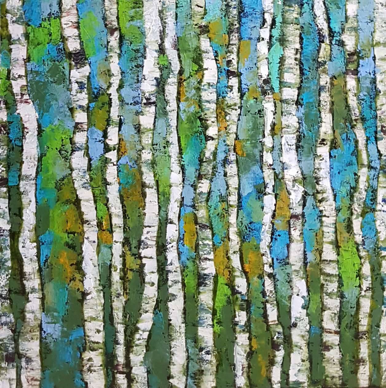 Na obrazie dominują smukłe, białe pnie brzóz, które rozciągają się pionowo przez całą kompozycję. Tło składa się z intensywnych plam zieleni, błękitu i odcieni złota, co nadaje scenie wrażenie nieustannego ruchu i żywotności. Kolory te zdają się migotać i tańczyć wokół drzew, nadając dziełu dynamiczny charakter. Atmosfera obrazu jest pełna spokoju i harmonii z naturą, która emanuje z każdej gałązki i liścia. Artysta zastosował technikę impasto, nakładając farbę grubymi warstwami, co dodaje pracy tekstury i głębi. Brzozy wydają się niemalże trójwymiarowe, jakby zapraszały do wkroczenia w głąb swojego leśnego królestwa. Ta technika sprawia, że obraz jest niezwykle tactile and engaging. Patrząc na to dzieło, trudno nie poczuć dziecięcej radości i zachwytu. Emanuje ono prostotą i pięknem przyrody, przypomina beztroskie chwile spędzone na łonie natury. Taki obraz przynosi spokój i wyciszenie, ale jednocześnie zaskakuje swoją żywością. "Te drzewa wyglądają jak w naszym ogródku!" – powiedziałoby pewnie dziecko. Kolorystyka i kompozycja mogą też budzić wspomnienia z dzieciństwa, kiedy każda wyprawa do lasu była przygodą pełną niespodzianek. Czasem warto się zatrzymać i zapatrzeć w to malarskie okno na świat.