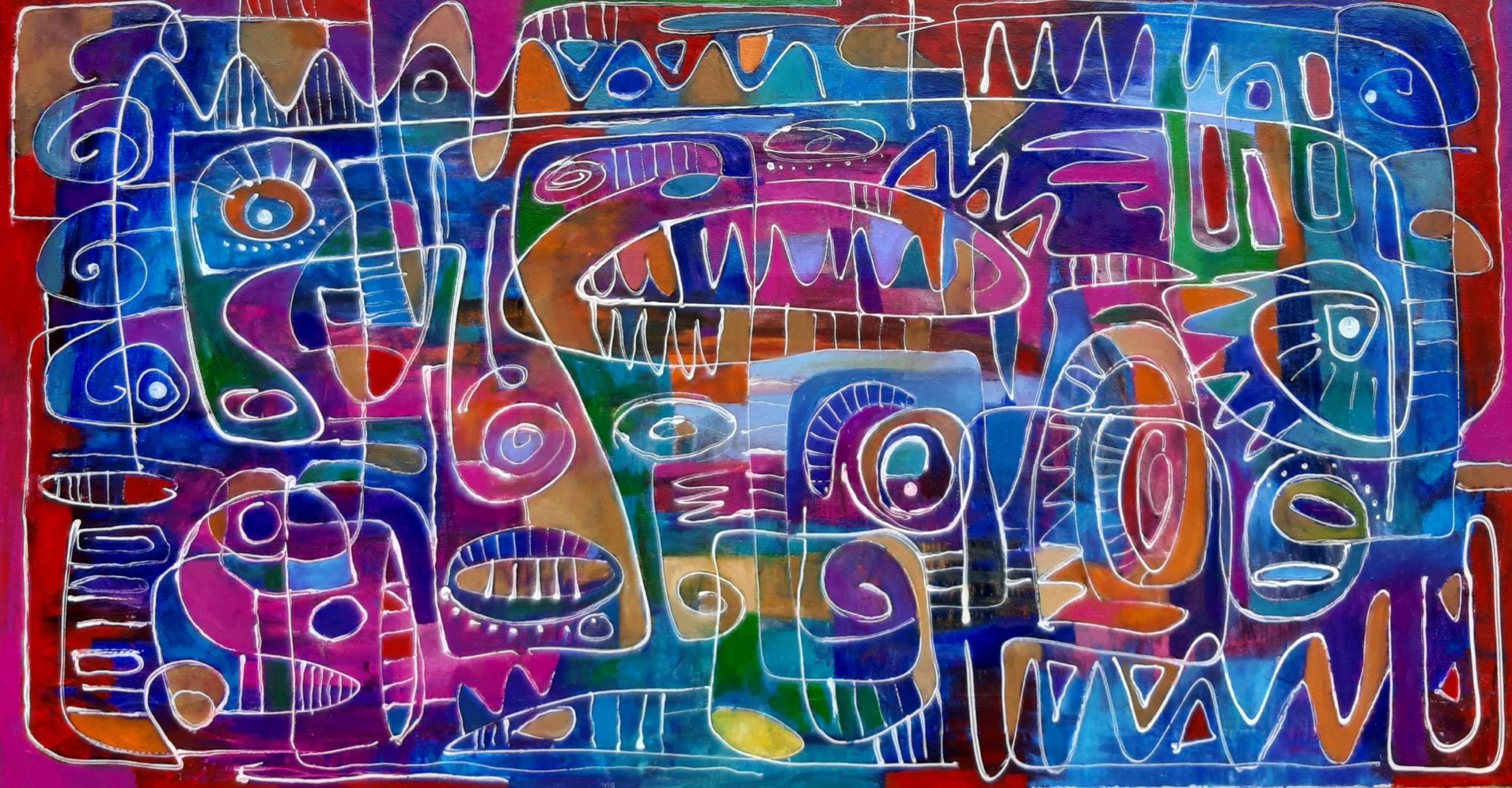 Obraz tętni kolorami niczym tęcza po burzy. Wibrujące fiolety, intensywne błękity i soczyste czerwienie przeplatają się z energetycznym pomarańczem i zielenią. Artysta bawi się kształtami, jakby malował w rytm muzyki. Linie wiją się i skręcają tworząc skomplikowaną, ale fascynującą mozaikę. Atmosfera obrazu jest zarazem chaotyczna i hipnotyzująca, jakby zapraszała do zagubienia się w jej zawiłościach. Styl przypomina dzieła art brut, z odrobiną szaleństwa i swobody. Patrząc na to, można poczuć, jak emocje przepływają przez ciebie jak rzeka, raz spokojnie, a raz gwałtownie. Obraz może budzić radość, zaskoczenie, a nawet niepokój. Wiesz, to taki kaleidoscope emocji. I gdy patrzę na to, czuję się jak dziecko, które odkrywa nowy, magiczny świat. Artysta użył technik mieszanych, tworząc fakturę, która dodaje głębi i ekspresji. Czy te linie to może jakieś tajemnicze mapy? Ciekawe, co one ukrywają. Ja osobiście widzę tam całą przygodę. Naprawdę awesome!