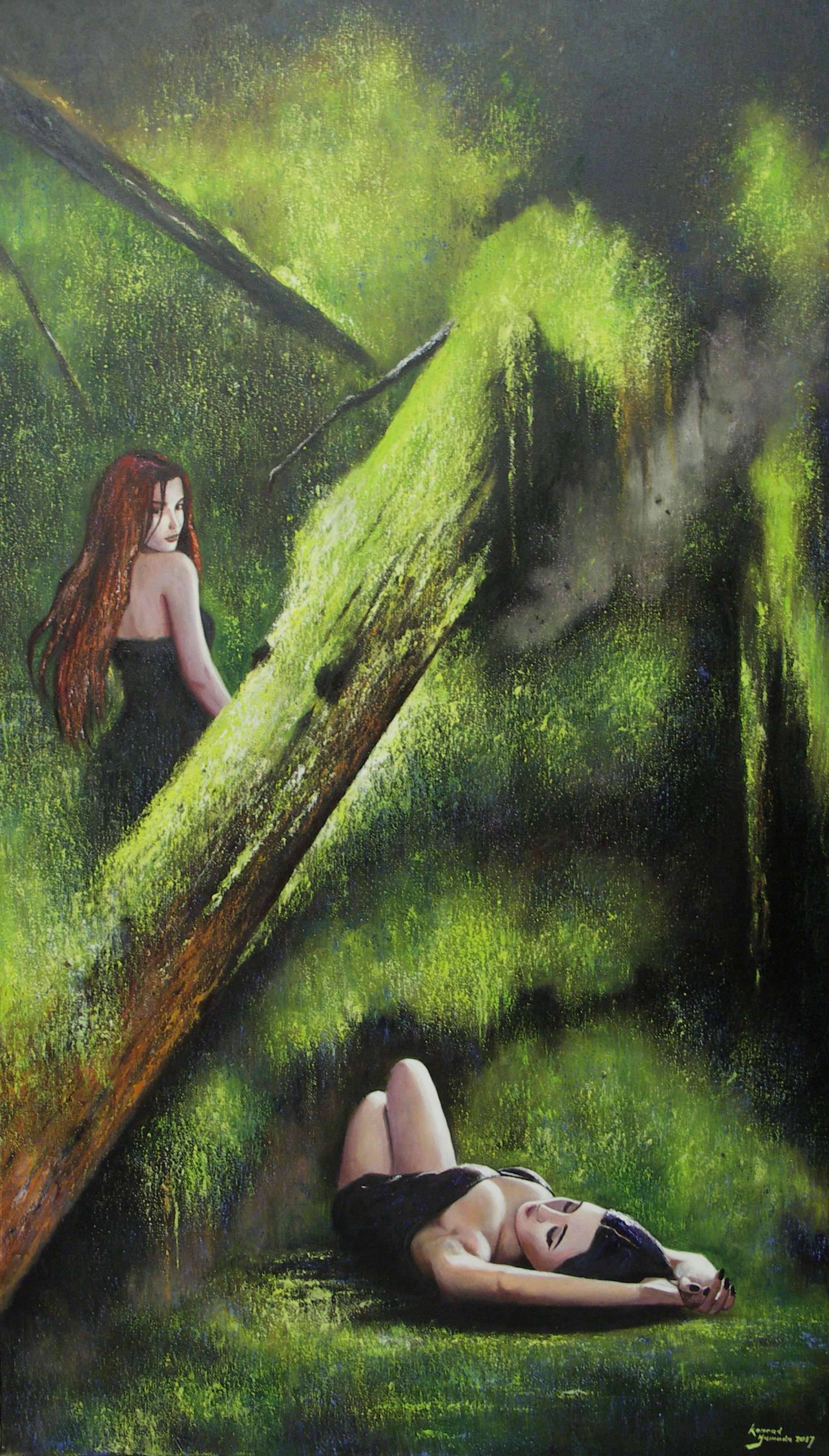Na obrazie dominują soczyste odcienie zieleni, przeplatające się z ciemnymi akcentami, tworząc gęsty, tajemniczy las. W centrum uwagi są dwie kobiety, jedna z długimi, rudymi włosami, stojąca z boku obrazu, a druga leżąca beztrosko na ziemi, otoczona mgłą zieleni. Kompozycja przyciąga wzrok w kierunku centralnego punktu, gdzie spoczywa postać. Całość emanuje atmosferą spokoju, ale i subtelnego niepokoju, jakby ukrywała jakieś secret. Styl artysty przypomina impresjonizm z jego miękkimi pociągnięciami pędzla, tworząc wrażenie ruchu w statycznym krajobrazie. Obraz może wywoływać poczucie nostalgii, przypominając o chwilach zatracenia się w naturze. U odbiorcy pojawia się mieszanka ciekawości i refleksji nad samą istotą wolności. Można odczuć, jakby kobiety były w harmonii z otaczającym je światem. Mój tata mówi, że takie obrazy to okno do innego świata. Dla mnie to trochę magiczne experience przebywać w takiej scenie. W końcu, mimo błędnego zrozumienia chaosu, jest coś pięknego w tej dzikiej harmonii.