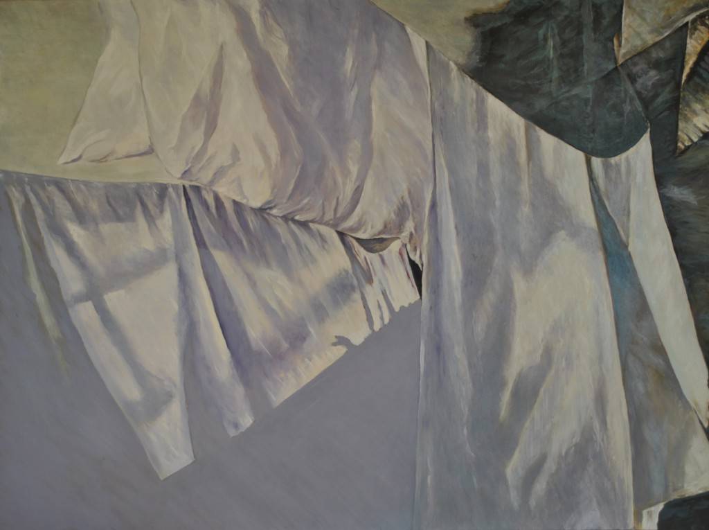Obraz przedstawia spokojną scenę, na której dominują delikatne, stonowane odcienie bieli, szarości i kremu. Ułożone na nim płótna czy tkaniny tworzą ciekawe, niemal abstrakcyjne formy, falujące na niewidocznym wietrze. Elementy te zestawione są w harmonijną kompozycję, co nadaje obrazowi równowagę. Atmosfera emanuje spokojem i ciszą, jakby czas się zatrzymał, a świat zapomniał o zgiełku codzienności. Styl artysty przypomina subtelny realizm z domieszką impresyjnych wpływów. Patrząc na to dzieło, można poczuć ciepło popołudniowego słońca, które tańczy na powierzchni materiału, wywołując poczucie nostalgia. Technika użyta przez artystę, precyzyjna, ale jednocześnie pełna swobody, sprawia, że tkaniny wydają się niemal namacalne. To właśnie ten "touch" rzeczywistości sprawia, że obraz jest tak pociągający. Dla siedmiolatka to po prostu suszące się pranie na podwórku w ciepły dzień. Obraz budzi w odbiorcy różnorodne emocje - od zadumy nad codziennymi detalami życia po czystą radość z prostoty przedstawionej sceny. Patrząc na ten obraz, można przenieść się myślami w miejsca, gdzie czas płynie wolniej i gdzie można delektować się chwilą.