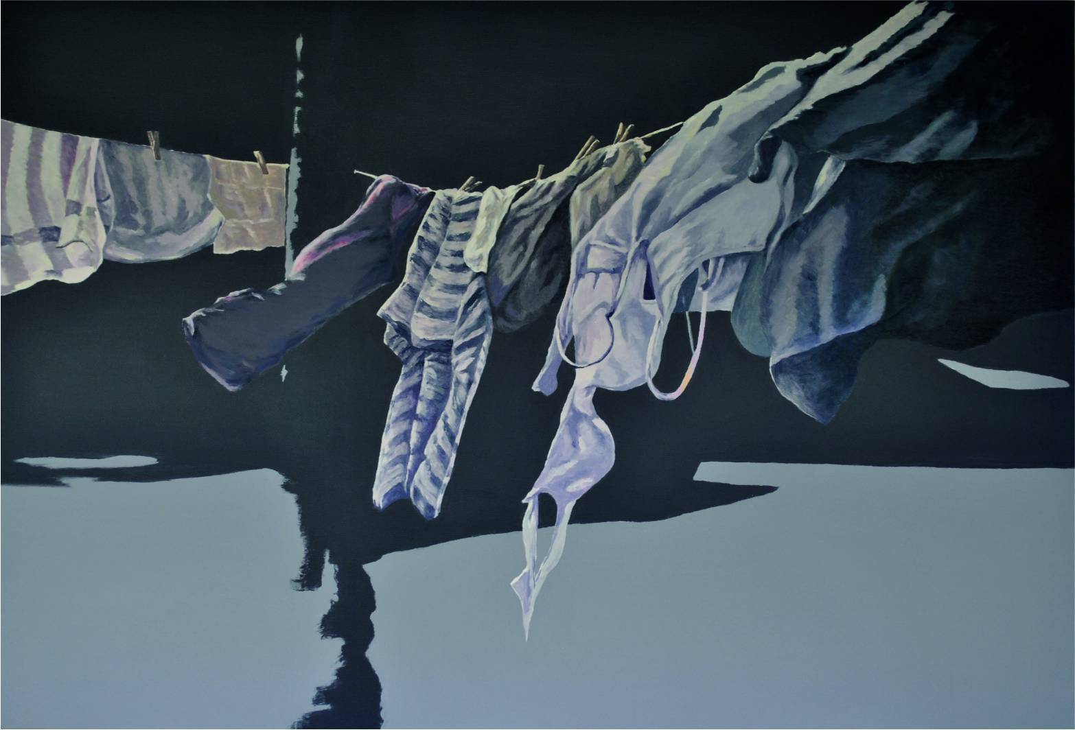 Na obrazie widzimy zaskakujący kawałek codzienności – pranie wiszące na sznurze, któremu towarzyszy gra świateł i cieni. Dominują zimne kolory: odcienie niebieskiego, szarości i delikatnego fioletu, które budują atmosferę spokoju i zadumy. Kompozycja jest prosta, ale jednocześnie hipnotyzująca dzięki efektowi światła, które tworzy intrygujące kontrasty. Technika malarska artysty opiera się na miękkich pociągnięciach pędzla, które nadają tkaninom delikatną fakturę, almost palpable. Obraz emanuje spokojem popołudnia, kiedy czas zdaje się zatrzymać na chwilę. Można poczuć ciepły powiew wiatru muskający tkaniny. Uczucie nostalgii przenika odbiorcę, przypominając chwile z dzieciństwa spędzone w domu babci. "A ja też chce huśtać się na tym praniu!" – pomyślałby 7-latek. Styl malarski przypomina nieco impresjonizm, gdzie grę świateł traktuje się jako istotny element kompozycji. Ta codzienna scena niespodziewanie wzbudza refleksje nad ulotnością momentów w naszym życiu.